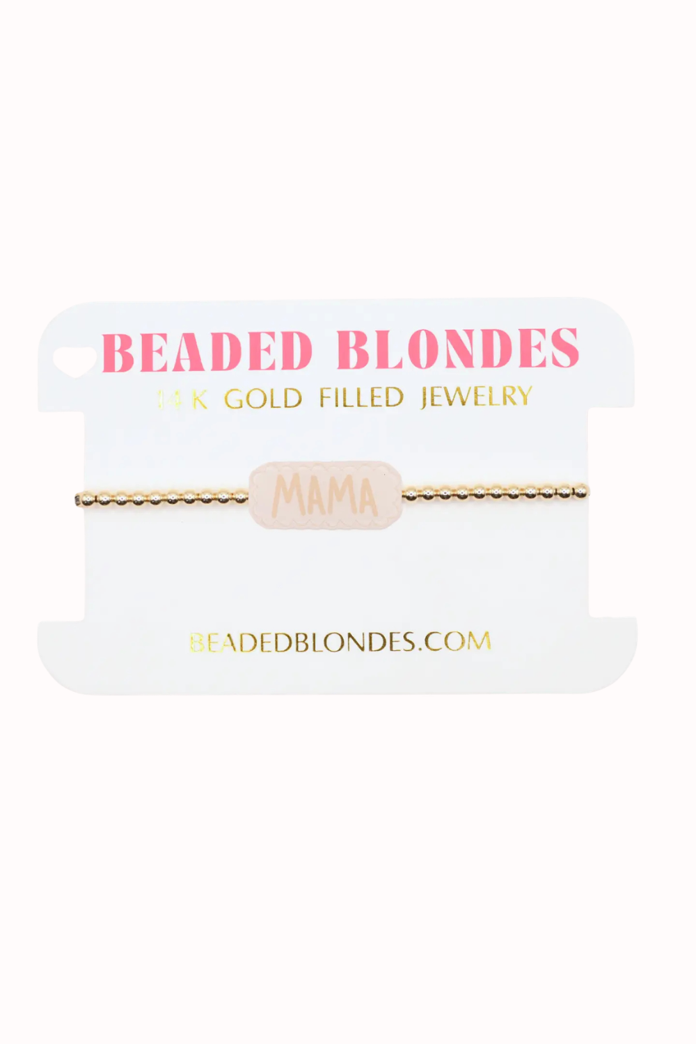 Beaded Blondes waterproof, sweat proof and generally life proof bracelets are here! A 3mm 14k gold filled beaded bracelet with an acrylic "Mama" block is a thoughtful and sentimental gift for Mother's Day and for new mother's. Available in 2 sizes.