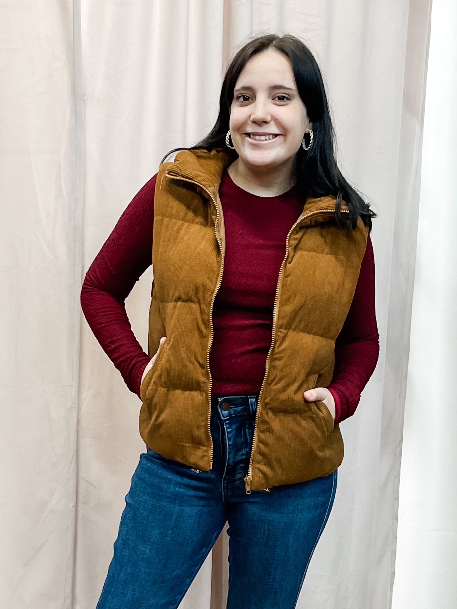 A camel-colored quilted corduroy puffer vest is the height of stylish texture combined with practical warmth. Layer over a lightweight mesh top for a mild day or add a thicker flannel or denim shirt for a cooler night. Wear it zipped up or open.
