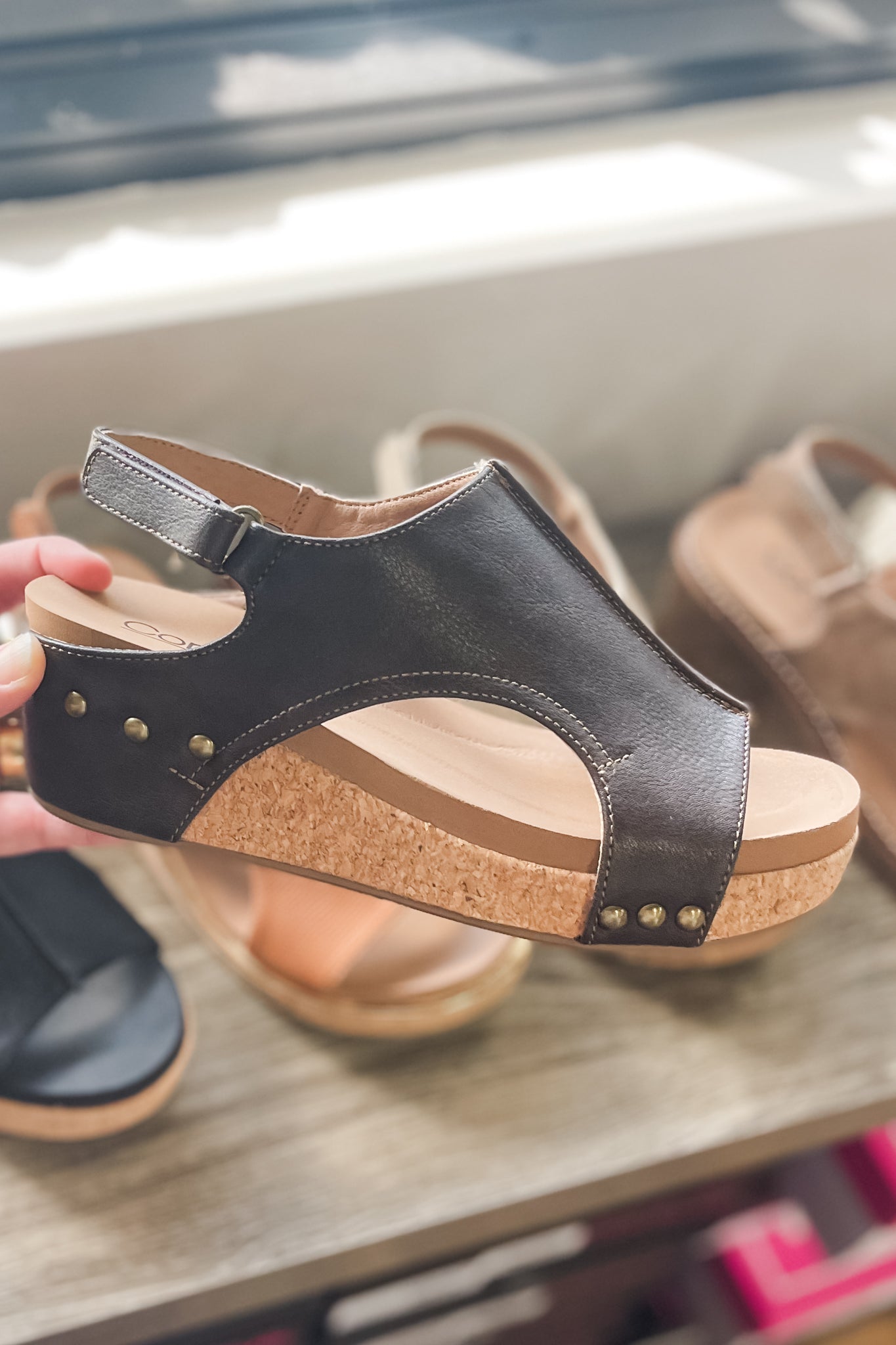 Featuring the signature Corkys cushioned insole, lightweight cork wedge, hook & loop velcro closure. A 1.75" heel height with .75" platform.