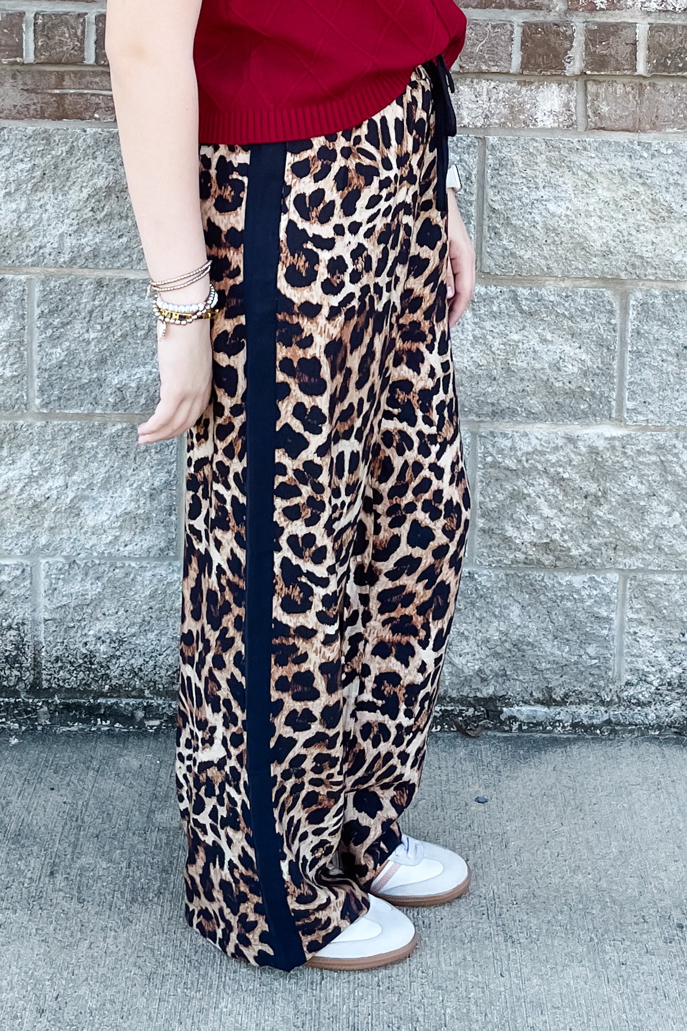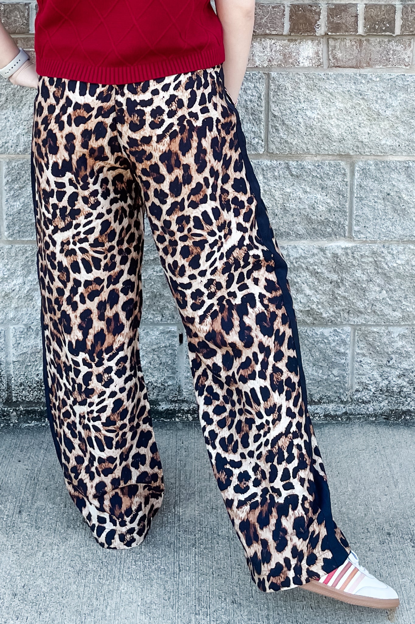 Do not blend in with the scenery - instead wear these daring leopard print track pants with the black side stripe for a look that will get everyone's attention! Dress these drawstring elastic waist pants up with a bold red sweater and our favorite Shu Shop Stevie sneakers in the red multi color stripes!