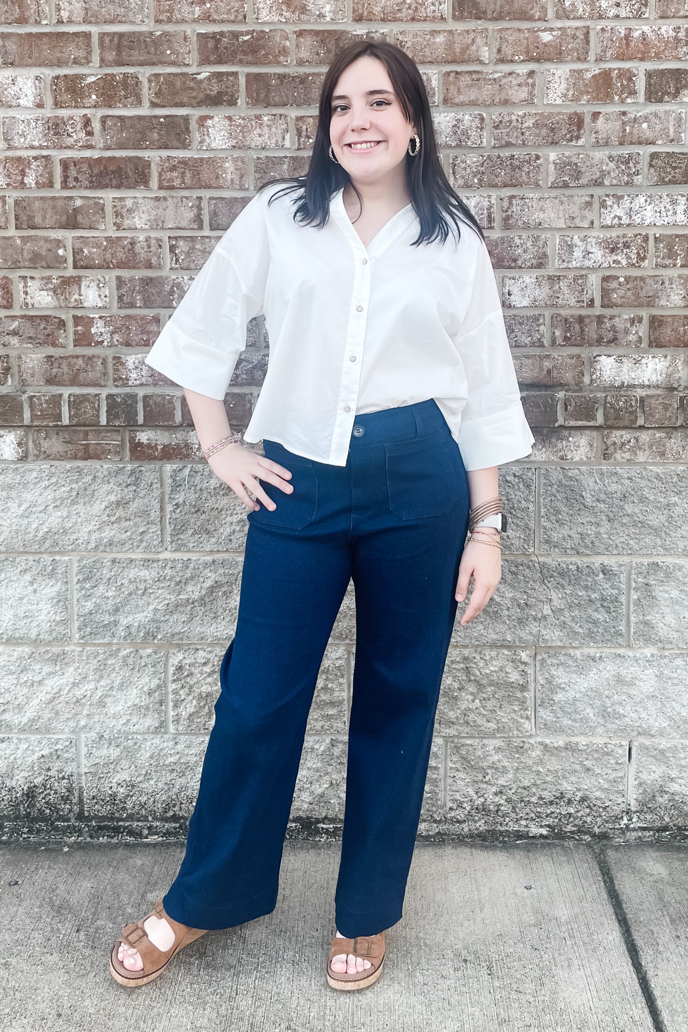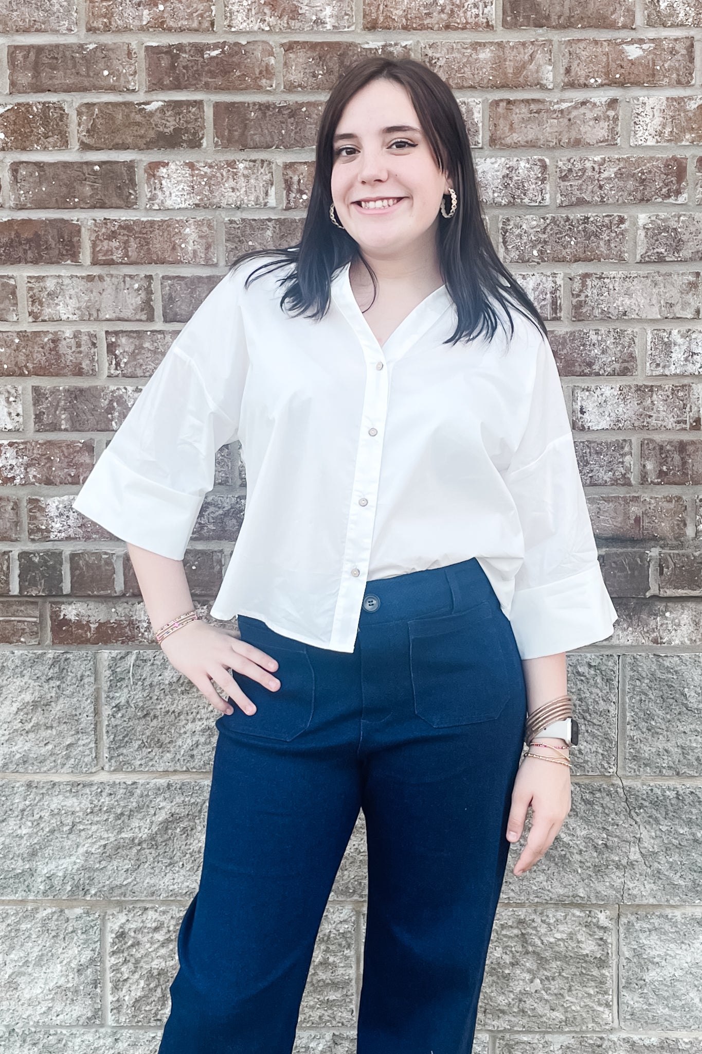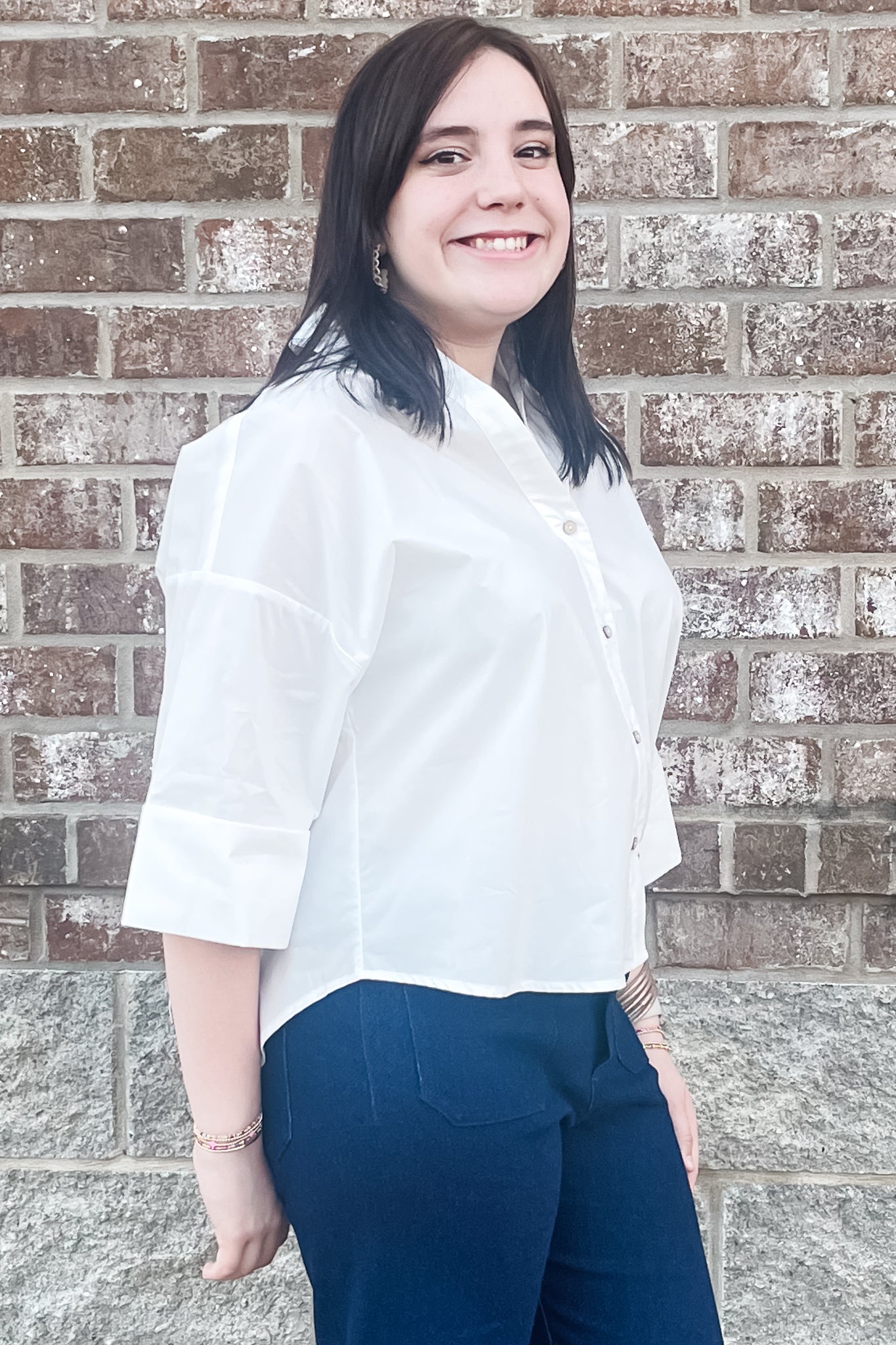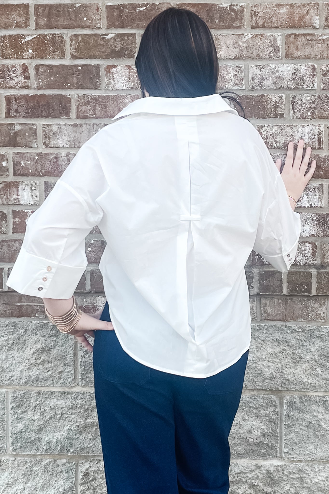 Look smart and chic in this collared button down crisp white blouse! It's a feminine take on the basic white button down featuring a back pleat, v-neck and wide, cuffed 3/4 sleeves.