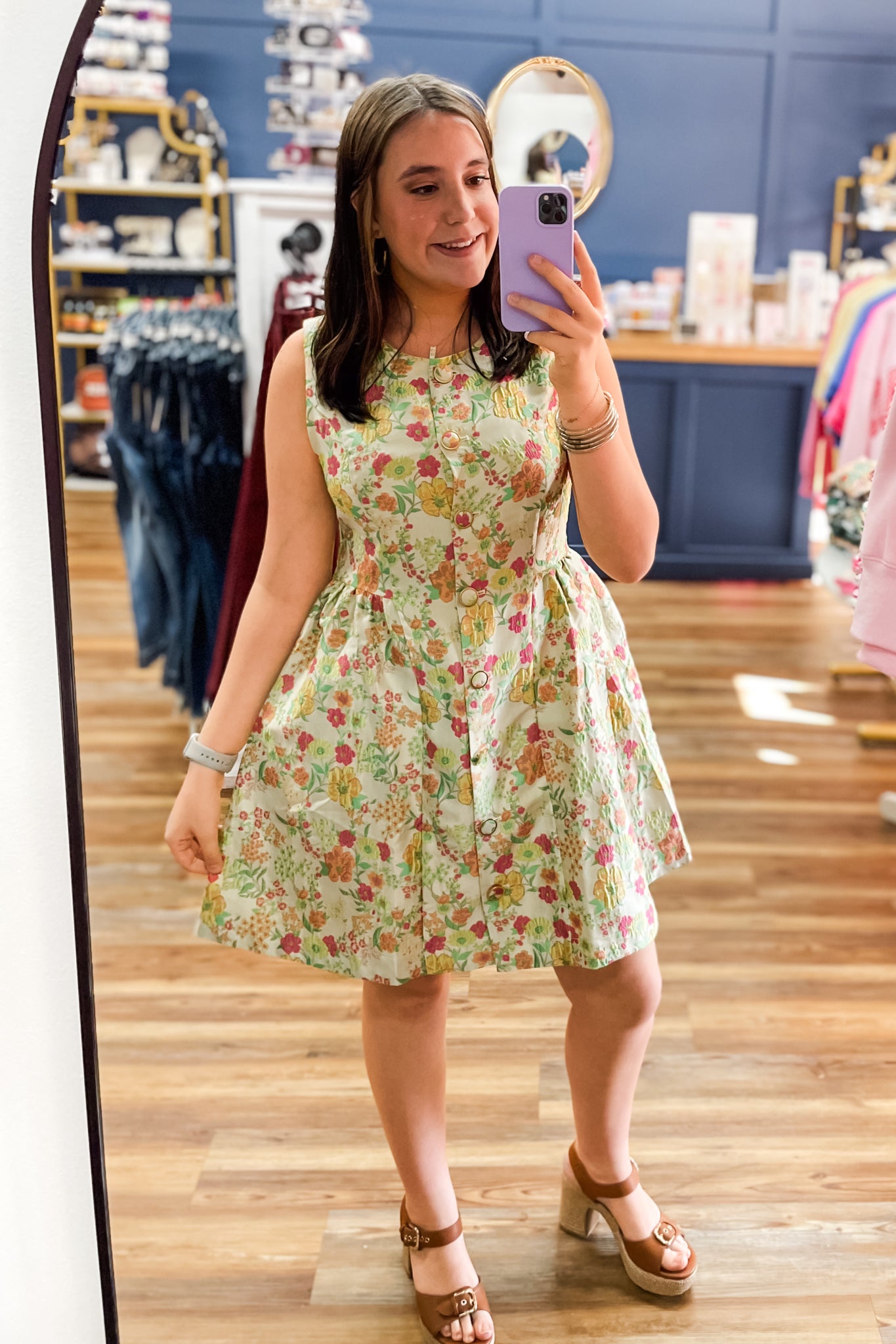 A beautiful spring floral dress from Entro. A mini dress with a full skirt and sleeveless top, button front closure and pockets. Ideal for Easter, church, weddings, showers, graduations, Mother's Day brunches and more spring events!