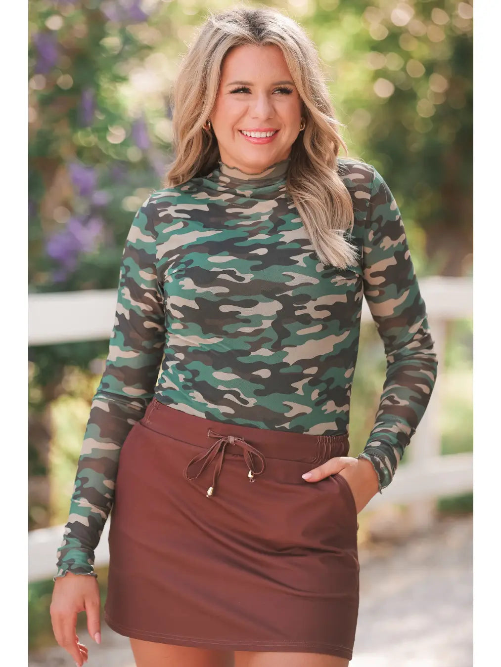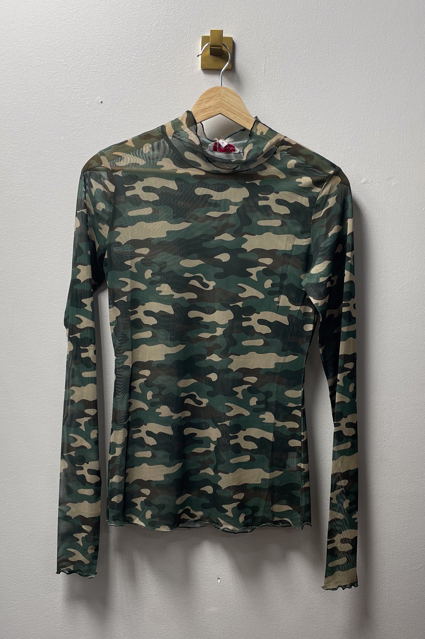 A green camo print semi sheer long sleeve mesh top from Jess Lea will be so on trend this season!