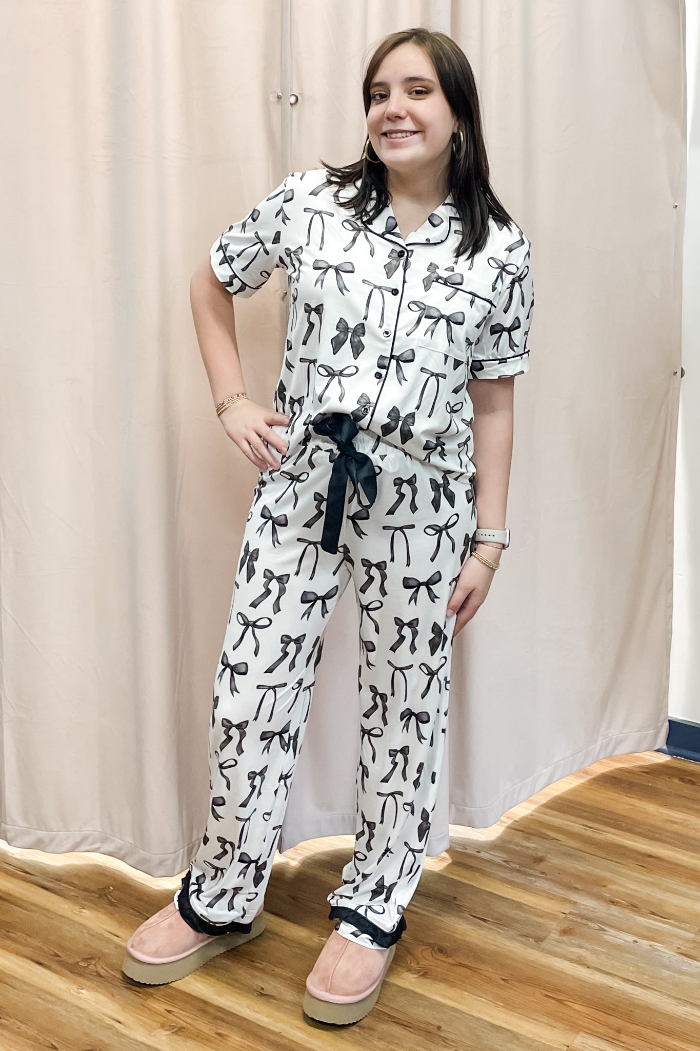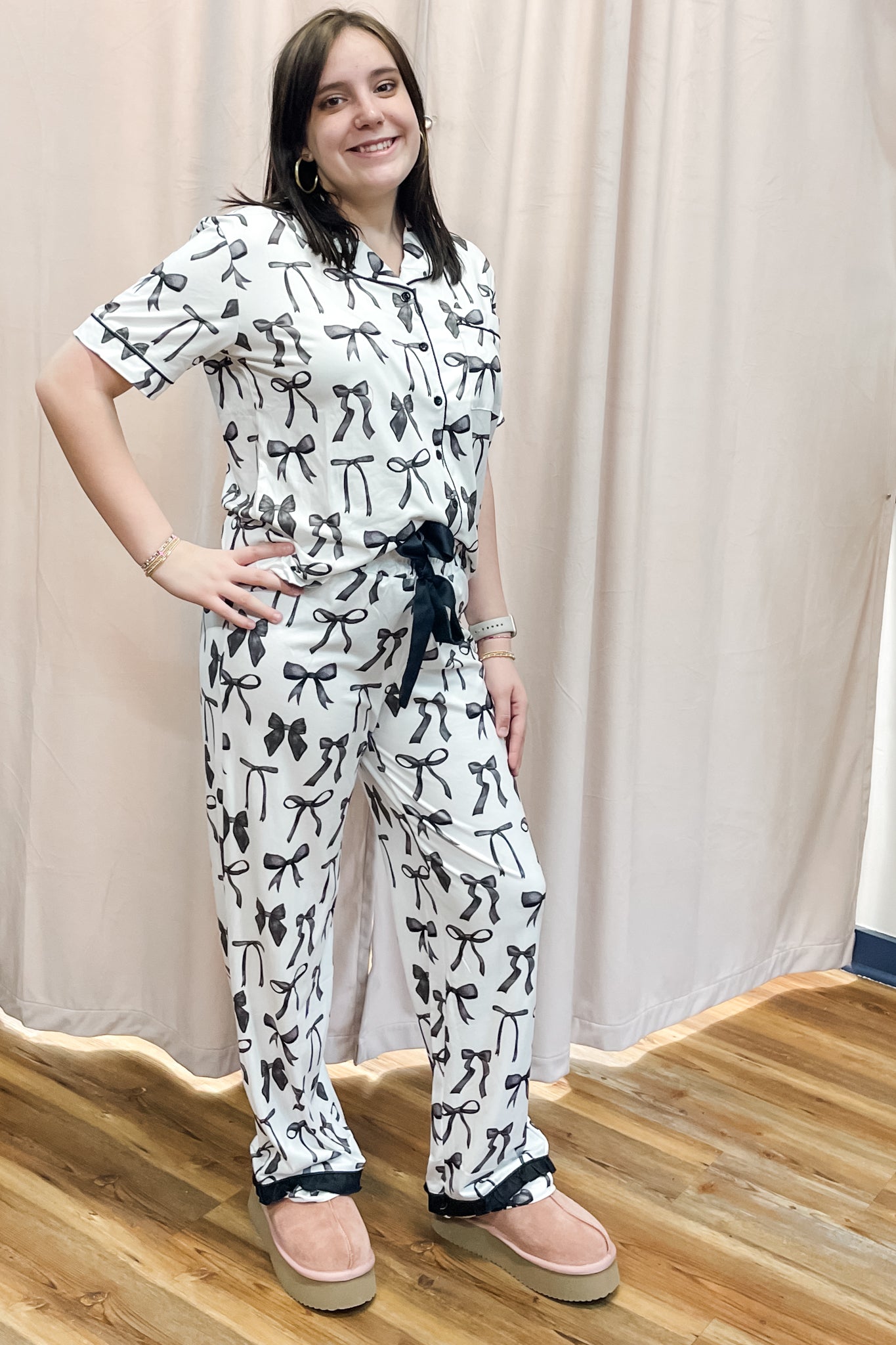 A cozy, comfortable pajama set from Jess Lea with a short sleeve button down, collared top with a chest pocket paired with elastic waist pants with a black hem ruffle and decorative front tie. The allover bows add a whimsical and cheery mood!