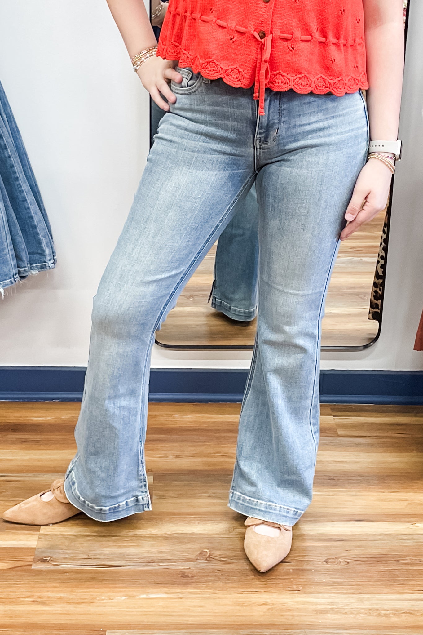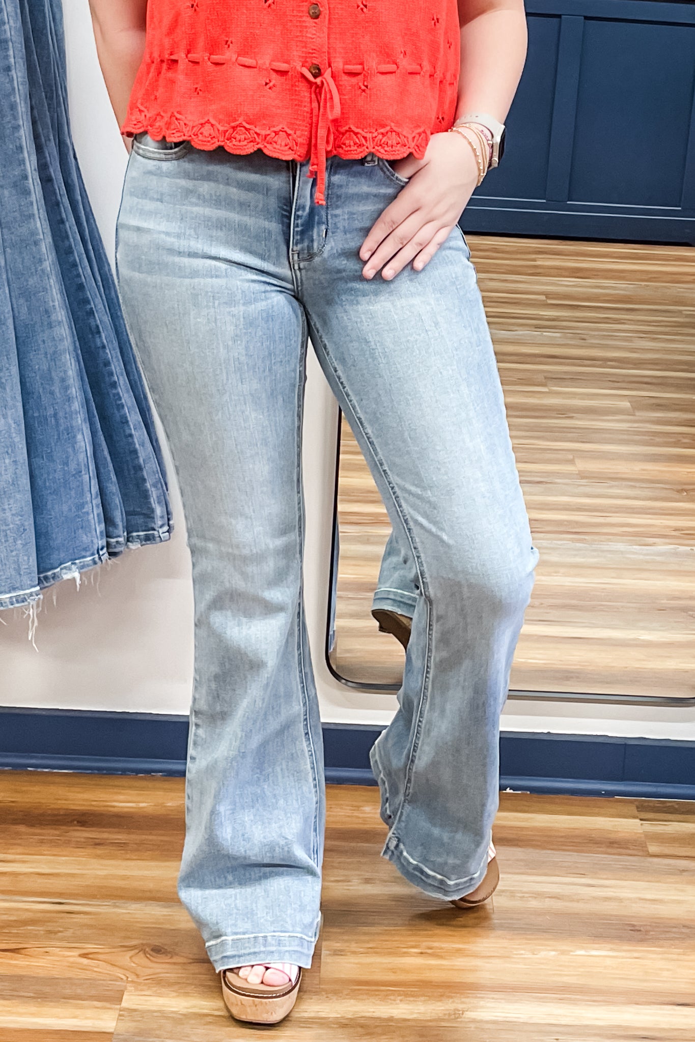 Another 3-inseam-option style of jeans from Judy Blue - this time in a mid rise flare! These jeans have some light distressing along the hem but otherwise none. The flare hem has a slit on the inside ankle at the hem for interest.