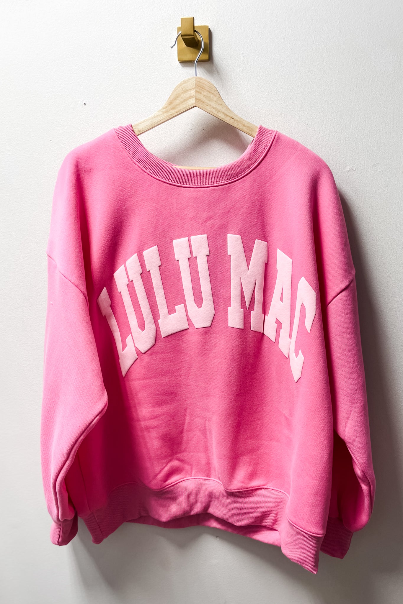 New uber soft and fleecy sweatshirts from Lulu Mac available in 2 pink color combos! Choose from pink with light pink puff lettering or light pink with pink puff lettering! Or embrace your princess era and snag both!!