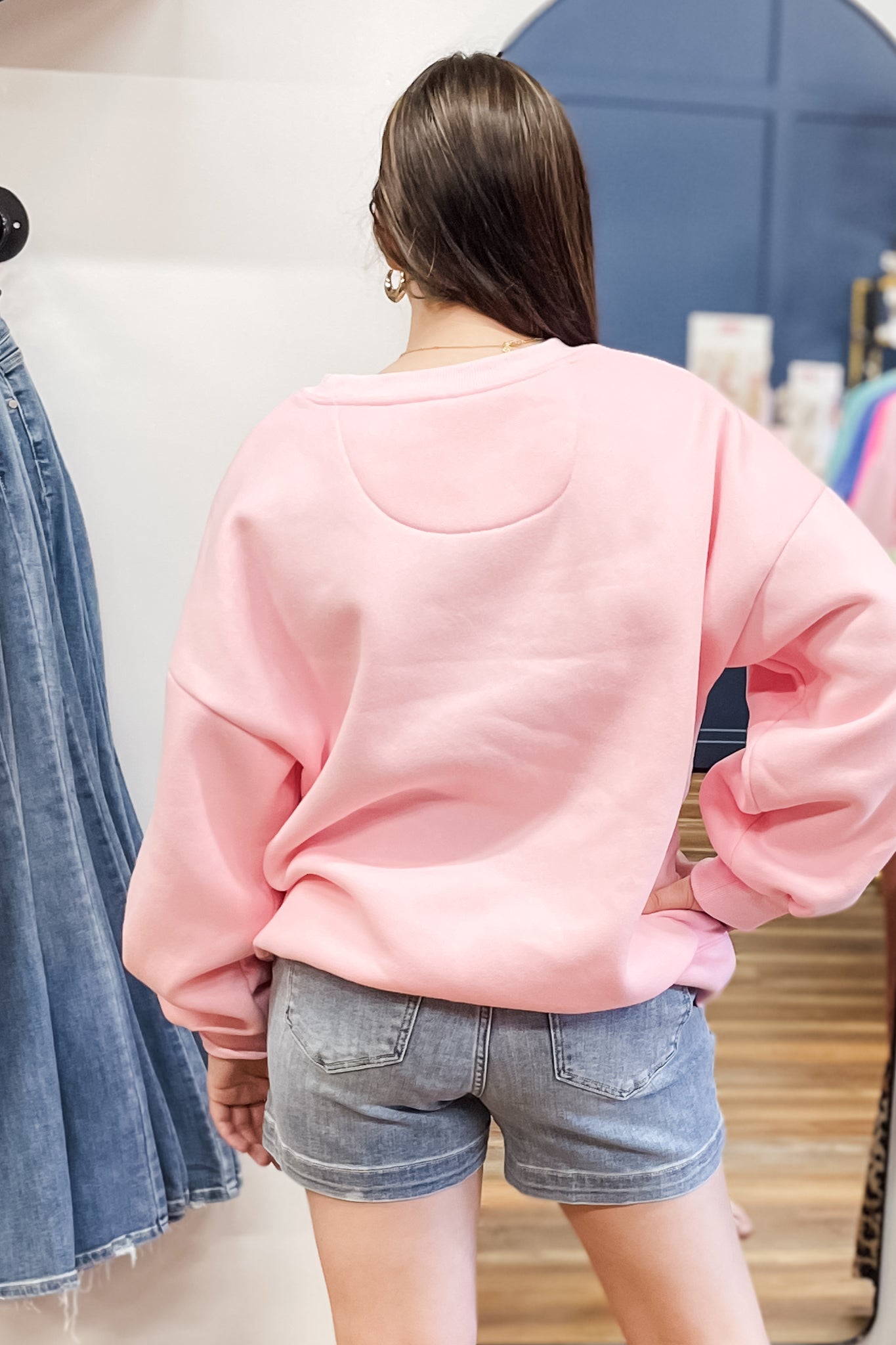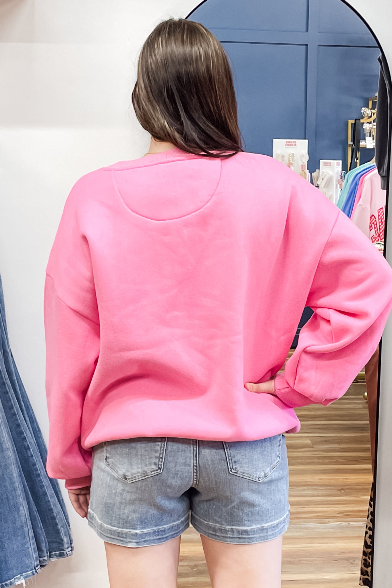 We love to wear sweatshirts oversized, paired with leggings or shorts or even jeans! I'll be wearing mine all year long even in warm month when I know I'm going to be in the a/c all day. Our model is wearing a size Large.