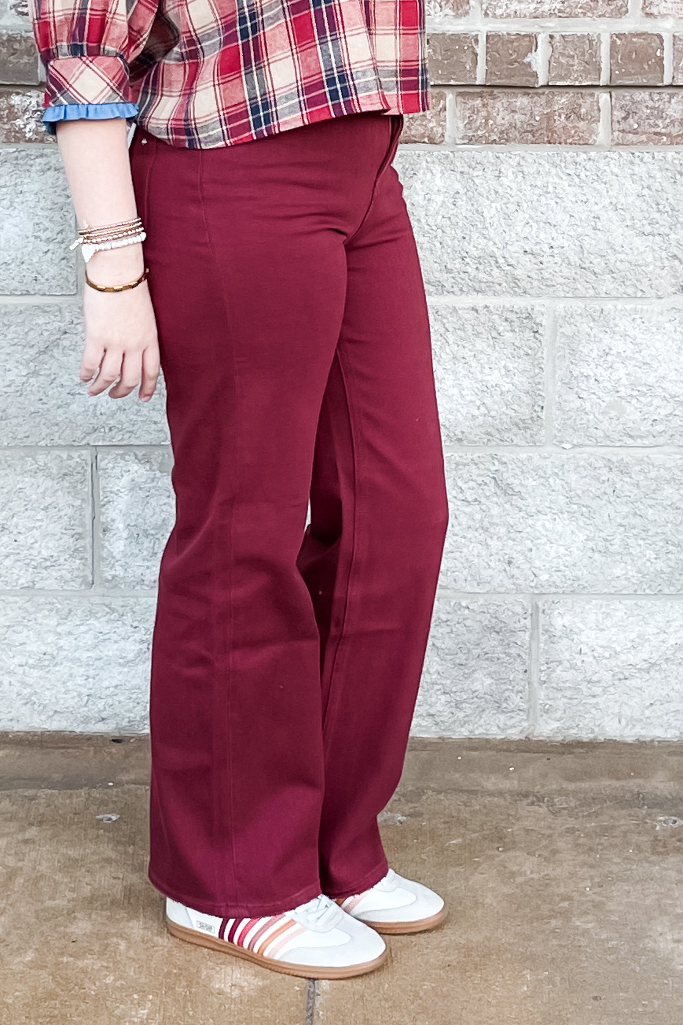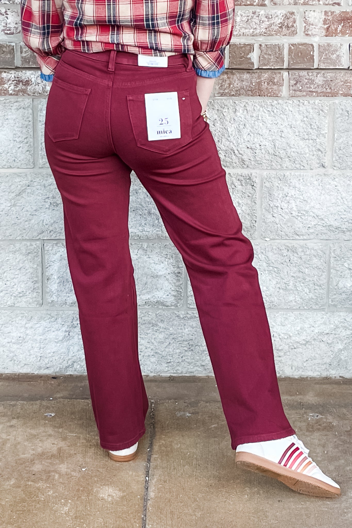 Wide leg burgundy colored jeans from Mica Denim are perfect for fall, winter and the upcoming holiday season. They look great paired with flannels, luxurious cozy sweaters or even a denim top for a more casual look. And wearing them with the Shu Shop Stevie sneakers with red multi stripes is a MUST!