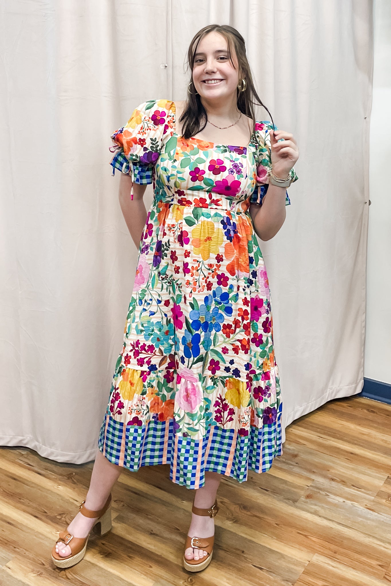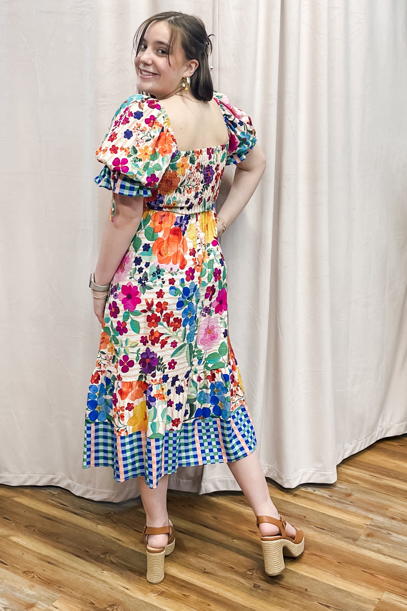 If you are looking for boring, Garden Party is not the dress for you! It's an explosion of bright and cheerful colors that will turn heads! I love how the border around the hem and sleeves is a different pattern than the the floral pattern of the dress. It adds to the fun! Featuring puff sleeves that can be worn on or off the shoulder and a square neck and a smocked back. Plus, it has pockets!
