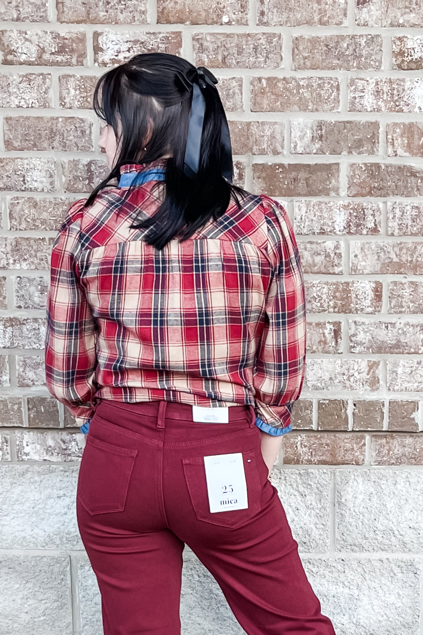 So whether you're picking out your tree, doing some holiday shopping or just like the festive look you'll love this top! And we love it paired with the burgundy wide leg jeans from Mica Denim!