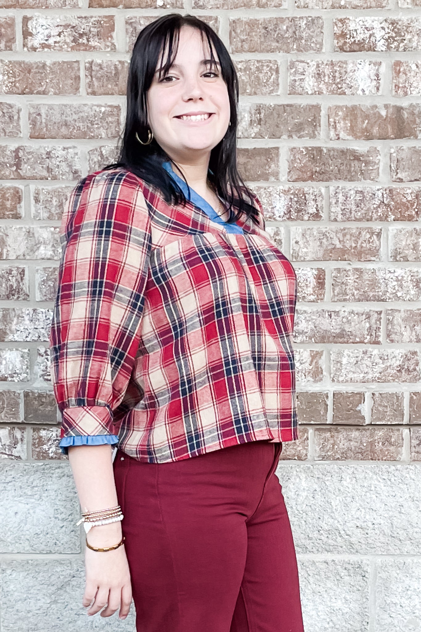 Flannel but make it girly! This plaid top from THML is a great holiday option this season! We love the feminine details like the offset denim trim plus the little ruffles around the neck and cuffs in a 3/4 length sleeve.