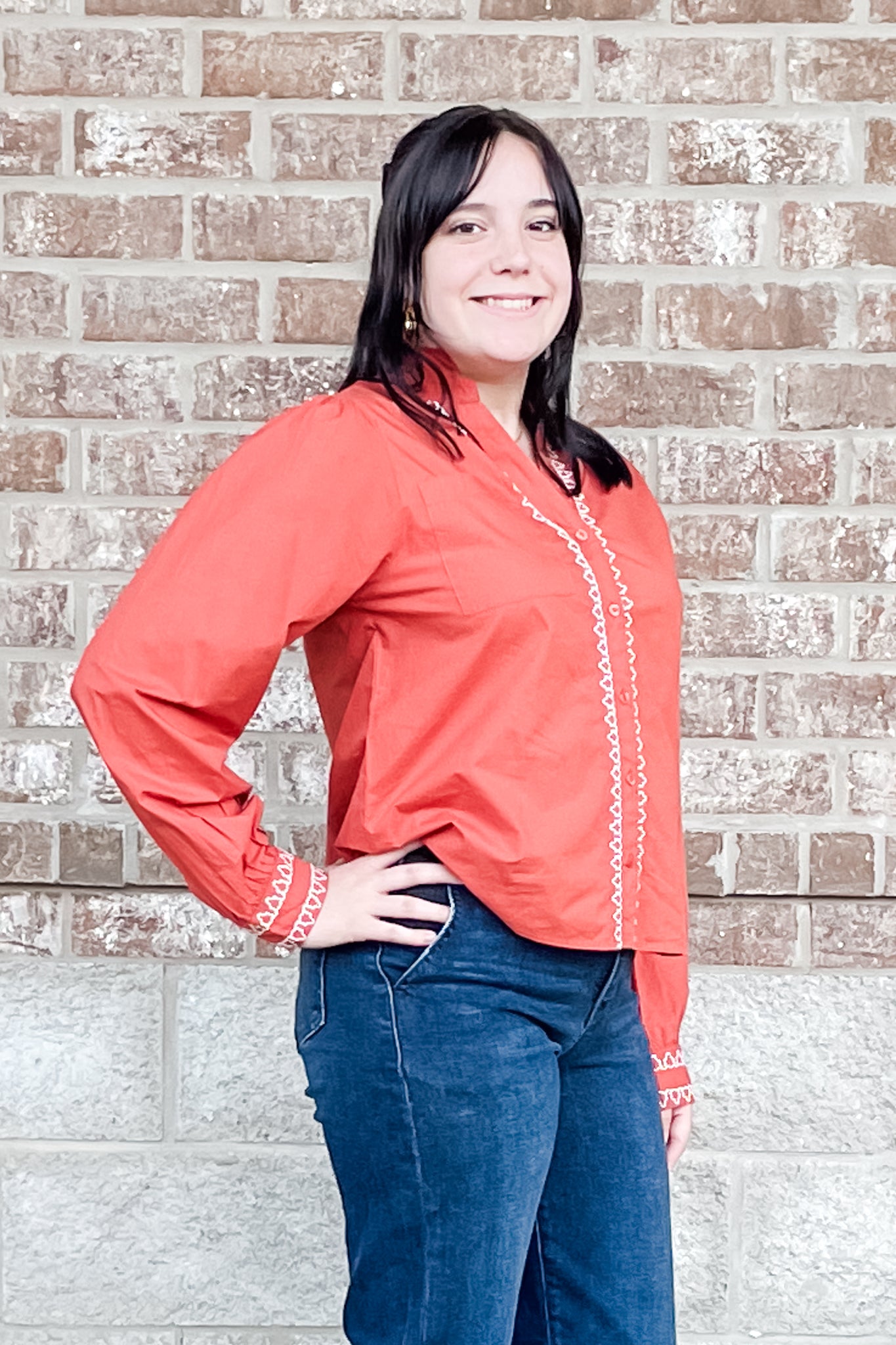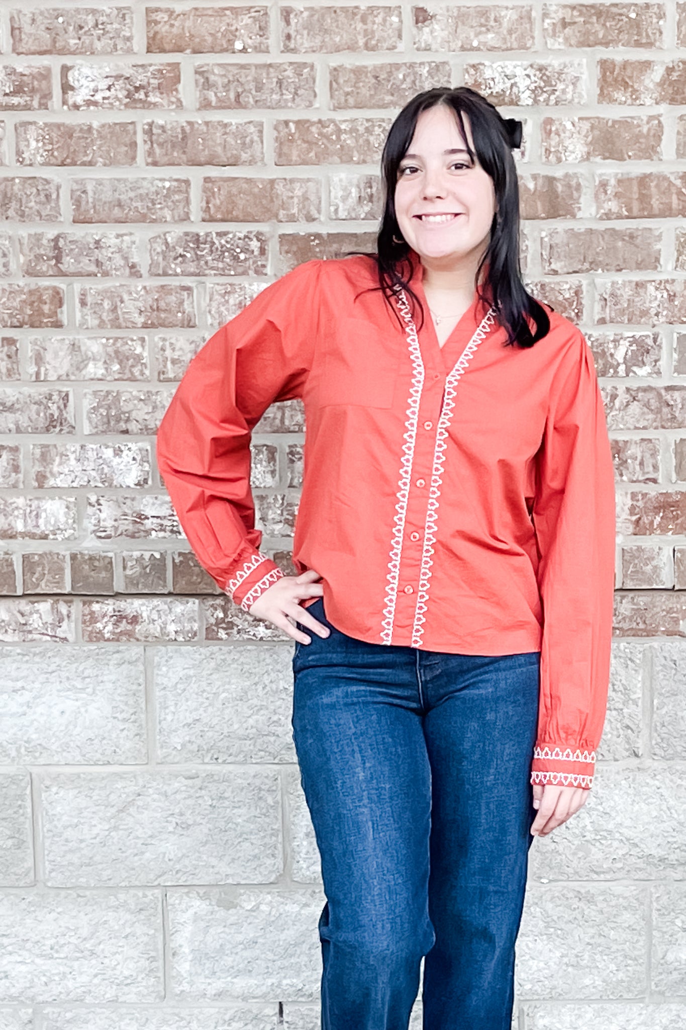 Whether you are layering it or wearing on its own, you'll appreciate the feminine details like the slightly pleated sleeves and cuffs, the flattering v-neck and the embroidery along the buttons and cuffs.