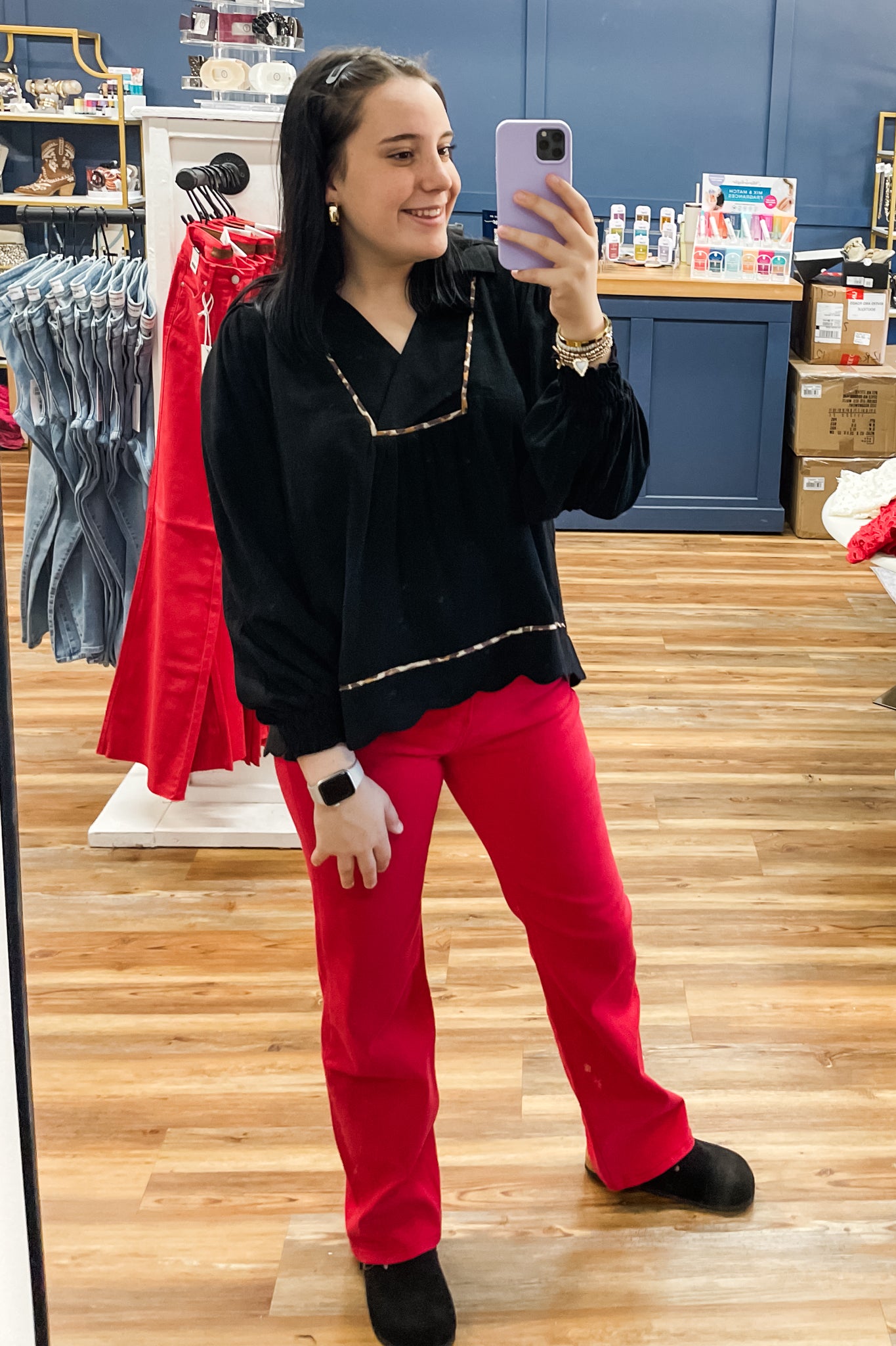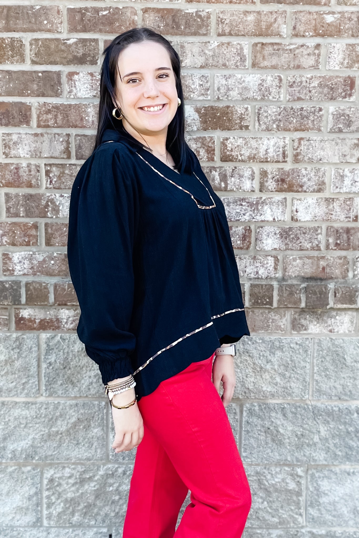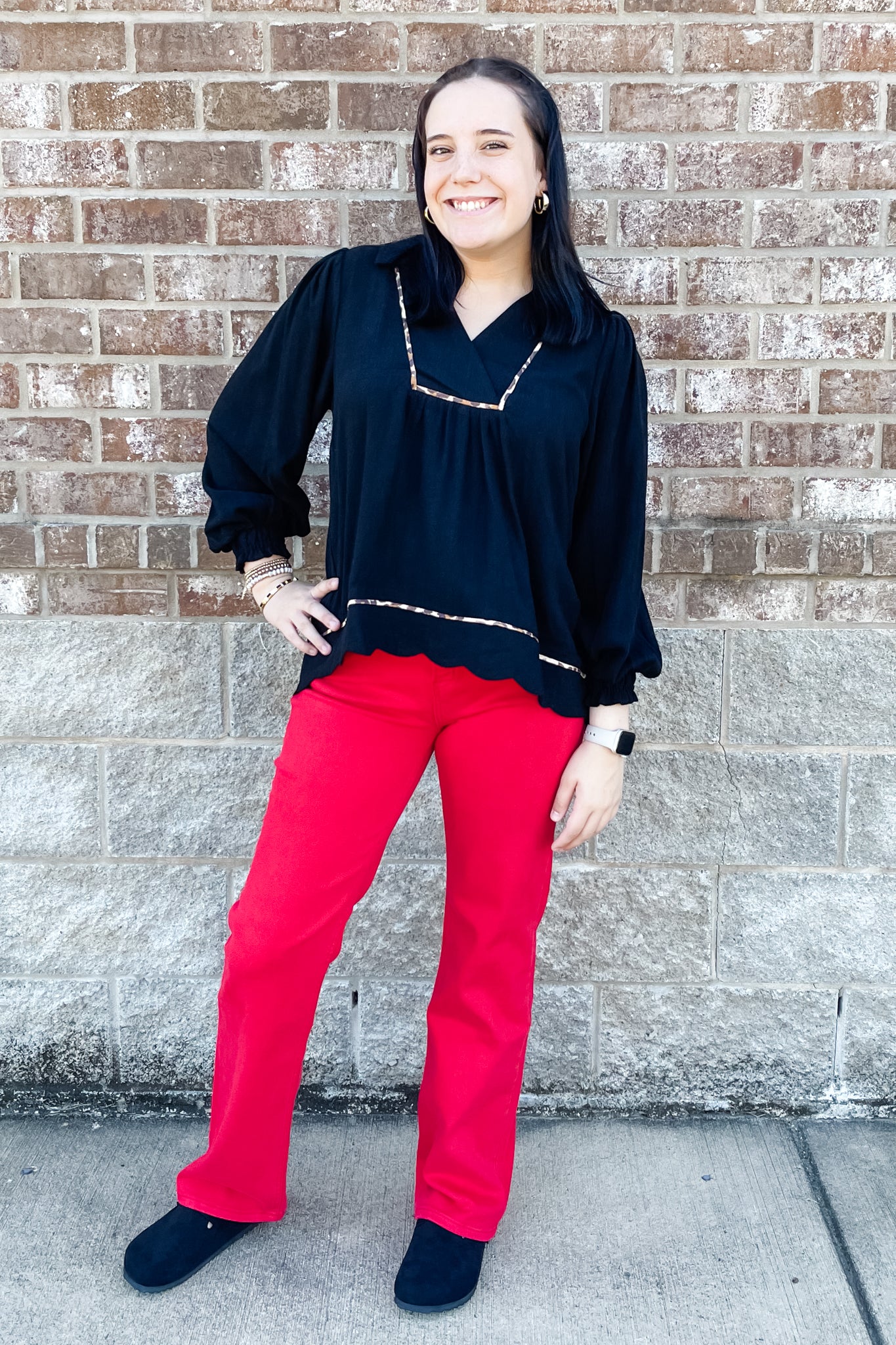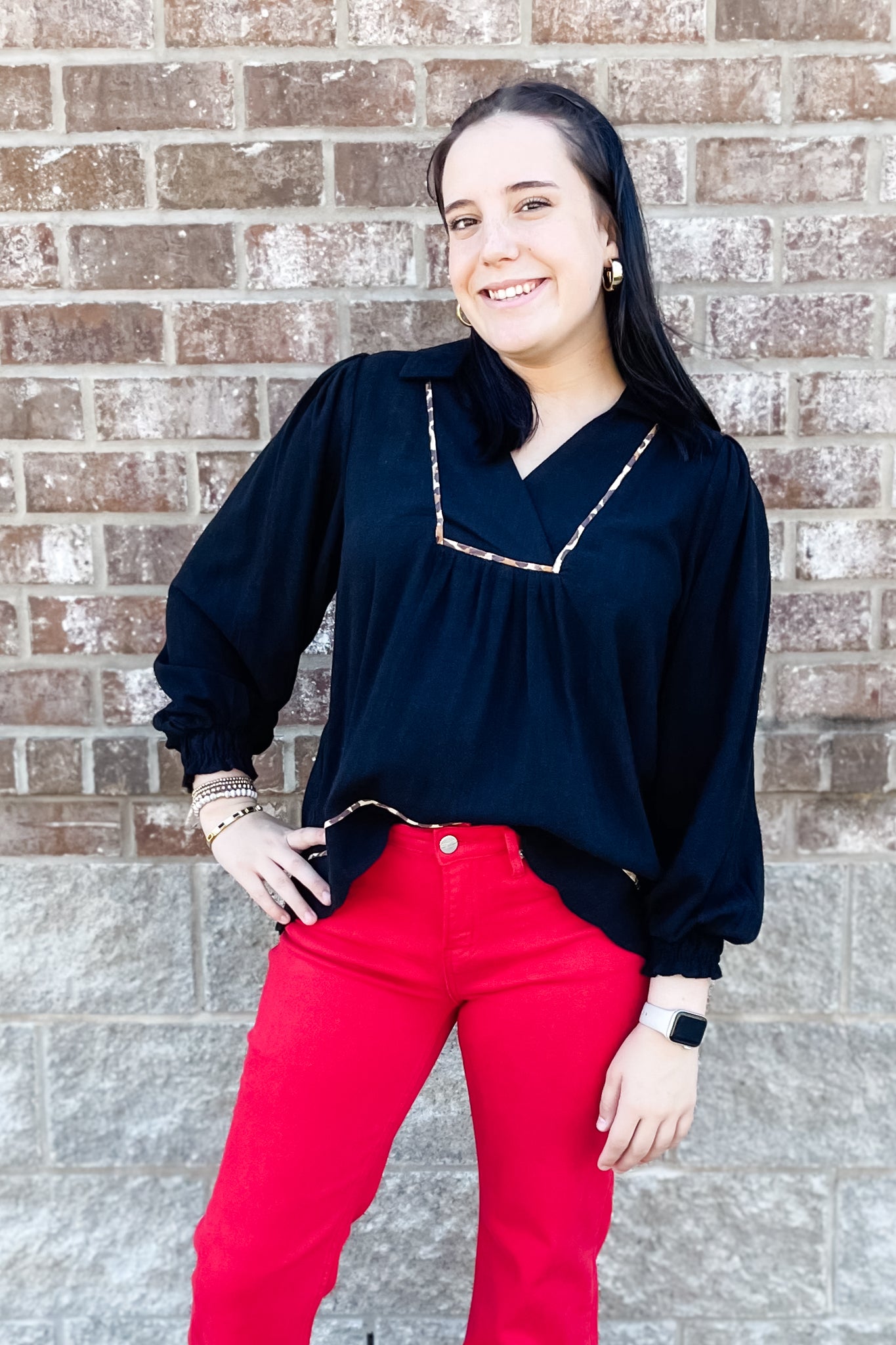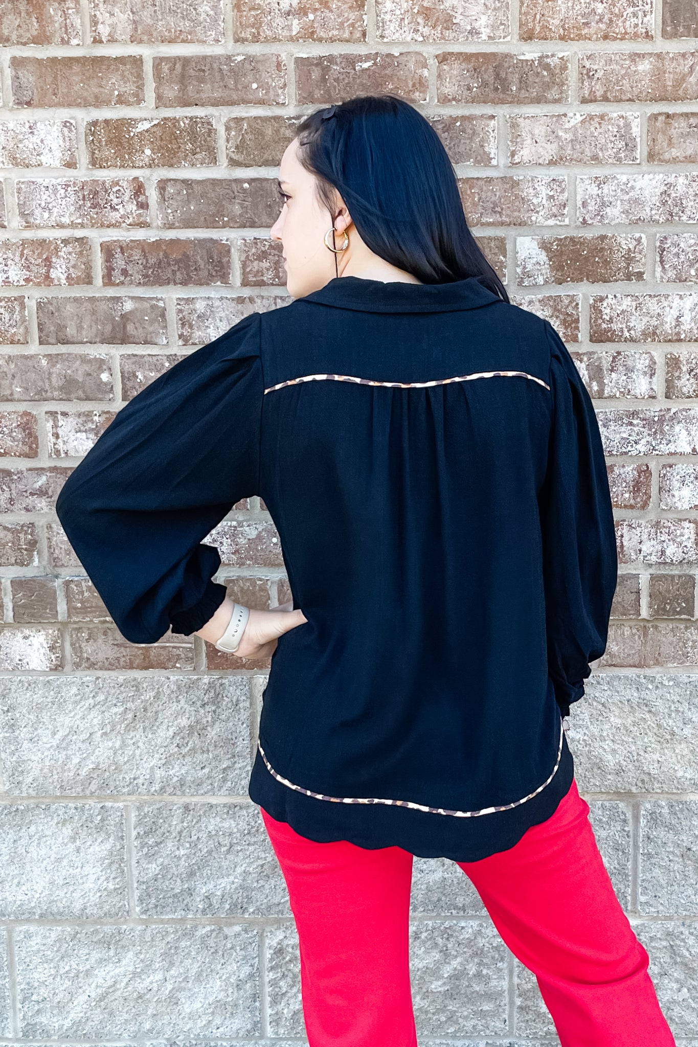 A long sleeve linen-blend top from Umgee for fall! I love this top because of its feminine details like the scallop hem and the leopard piping trim and the long bishop sleeves with elastic cuffs. Pair this top with red because red + leopard = love! How's that for girl math?!