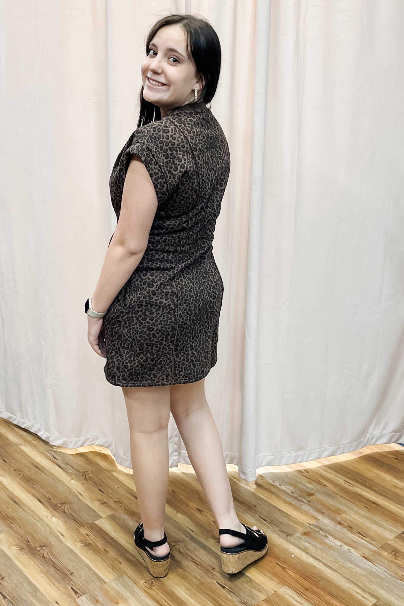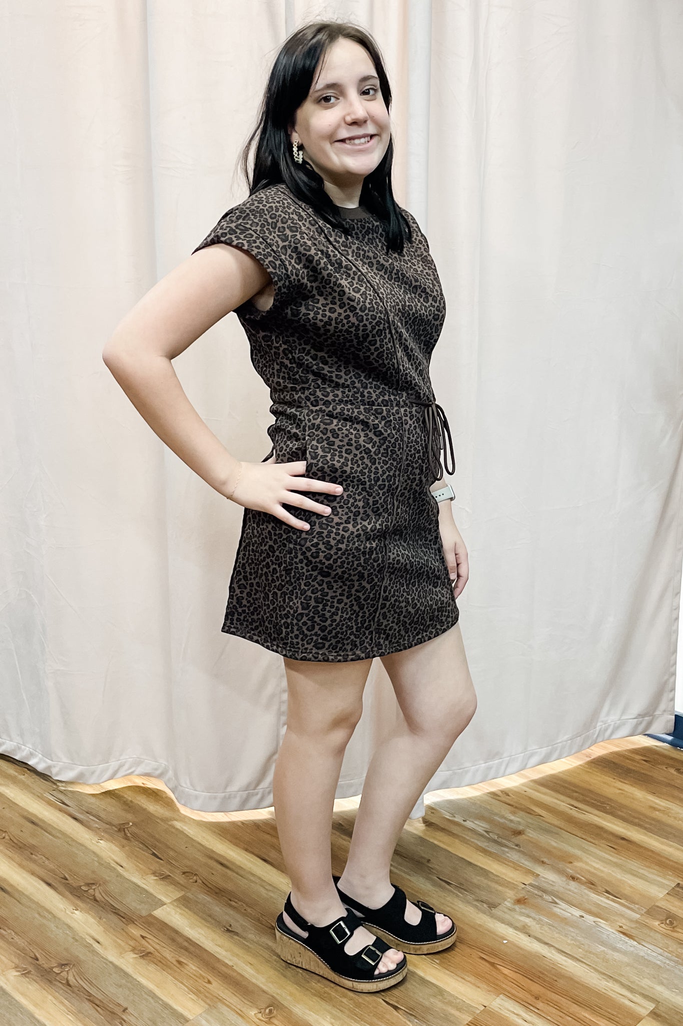 A sporty mini dress from Umgee in a dark leopard print featuring a flattering drawstring waist, short cap sleeves and side pockets. Pair with sneakers for a chic yet casual look.