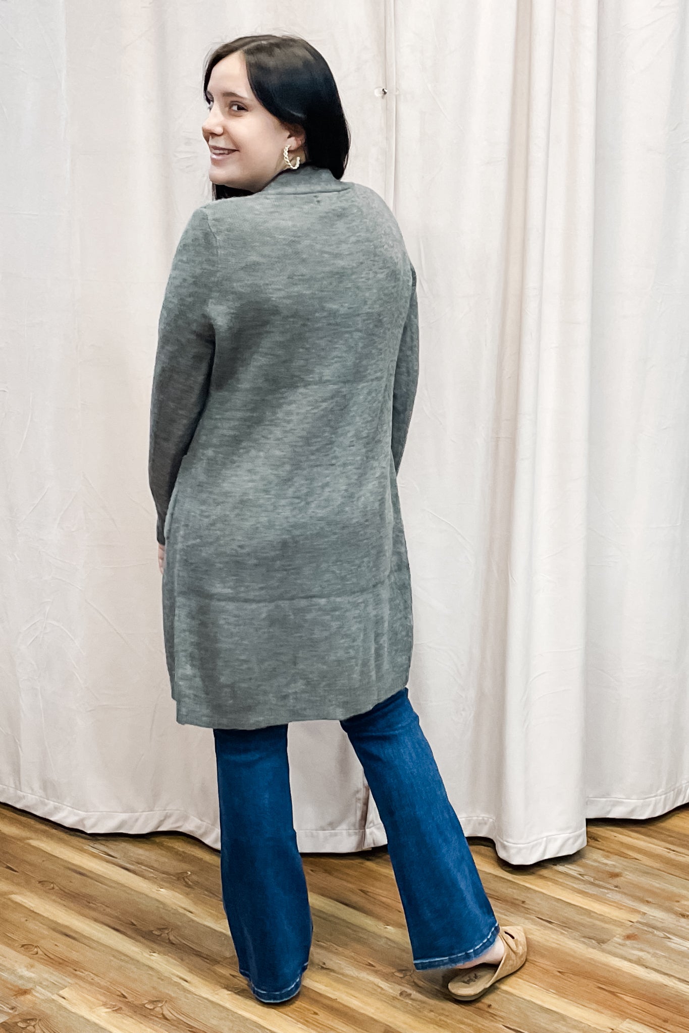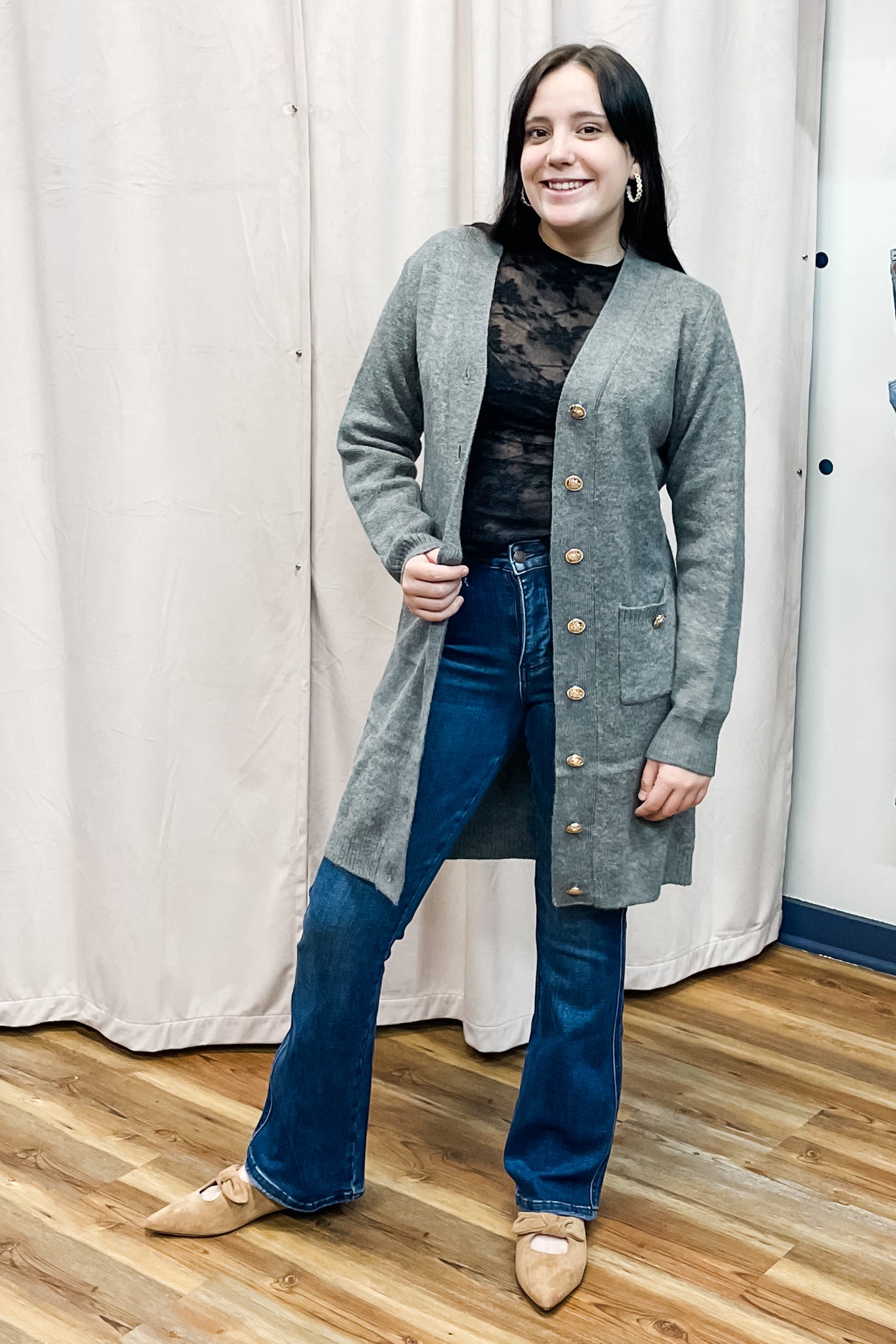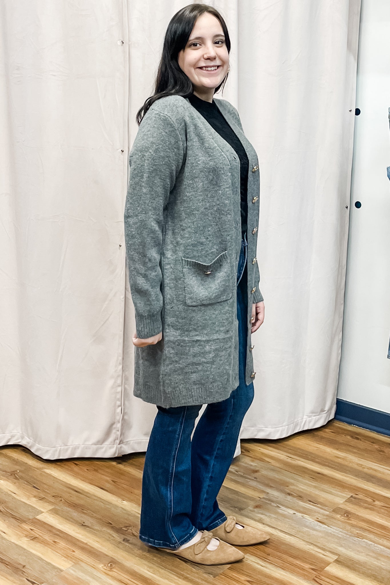 A chic yet cozy long cardigan that can really dress up an outfit. A classy charcoal color with gold tone buttons giving a preppy vibe and deep pockets. We love it paired with a short dress or skirt combo!