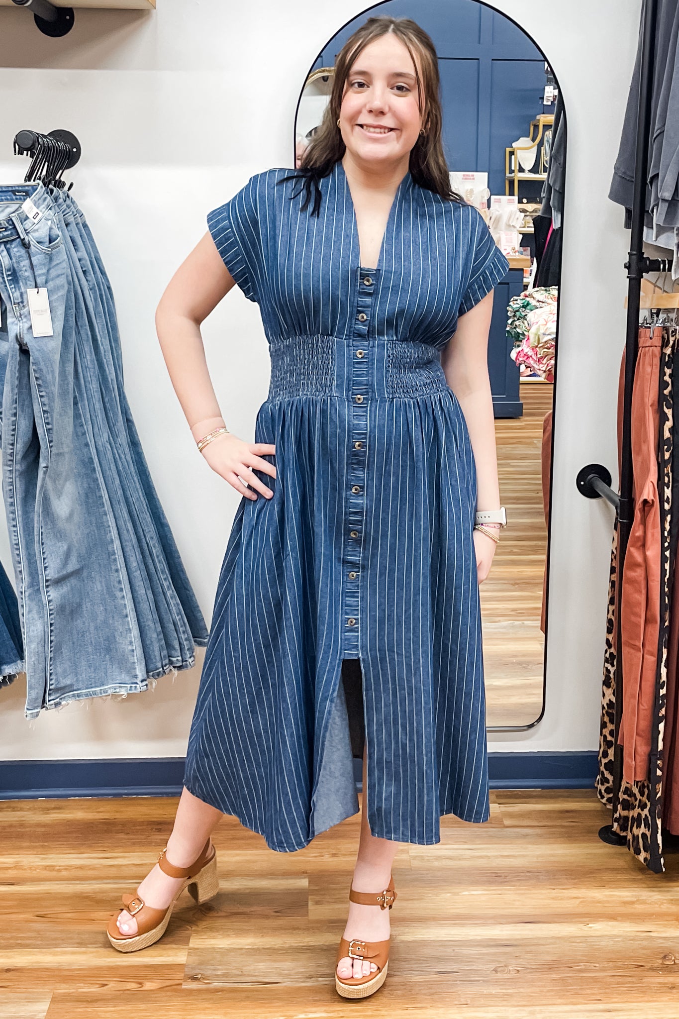 Donna is a figure-flattering denim midi length dress with a plunging neckline and button up front and cinched, smocked waist. The short sleeves feature a small cuff with a dolman silhouette. And pockets!
