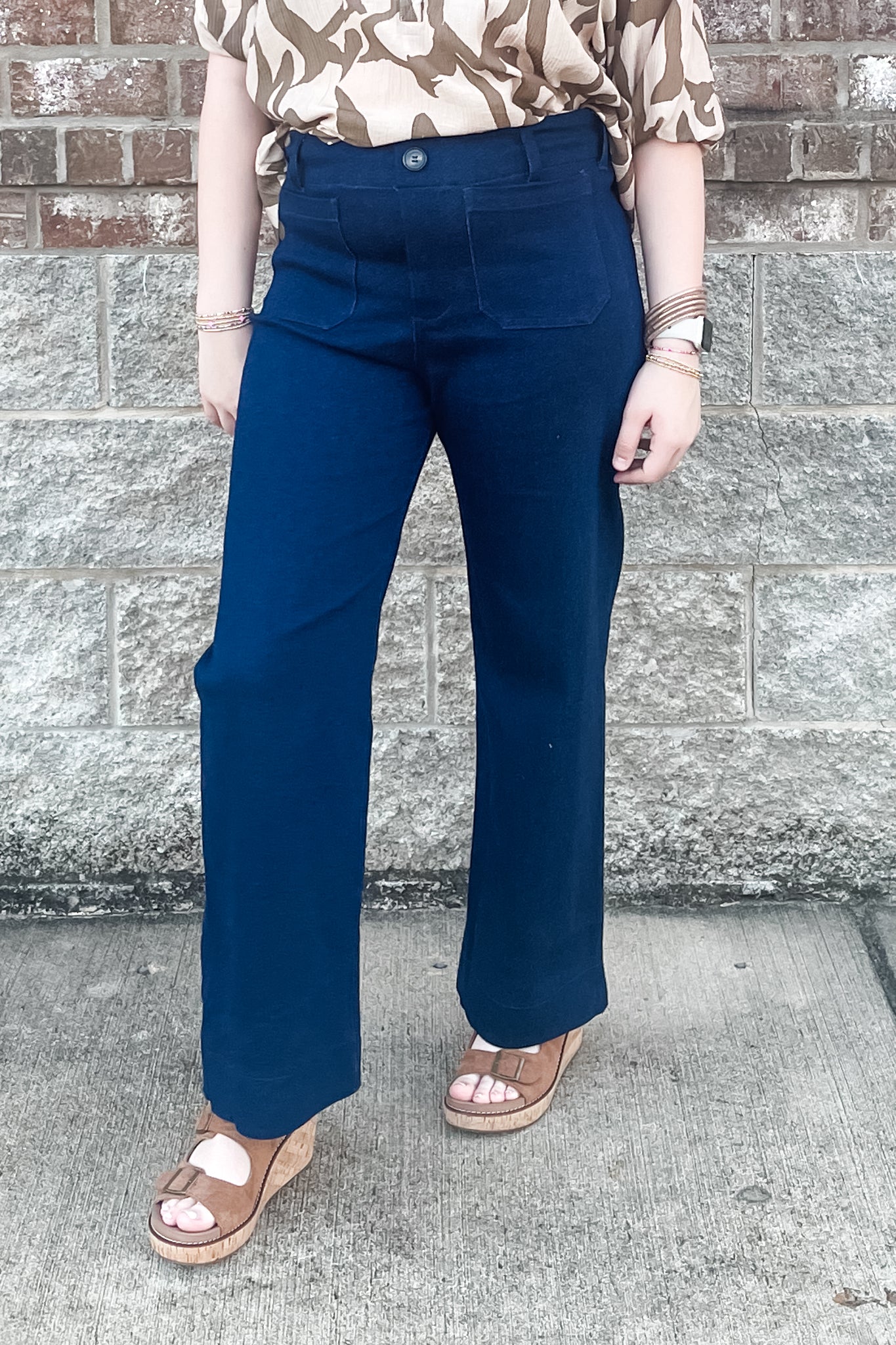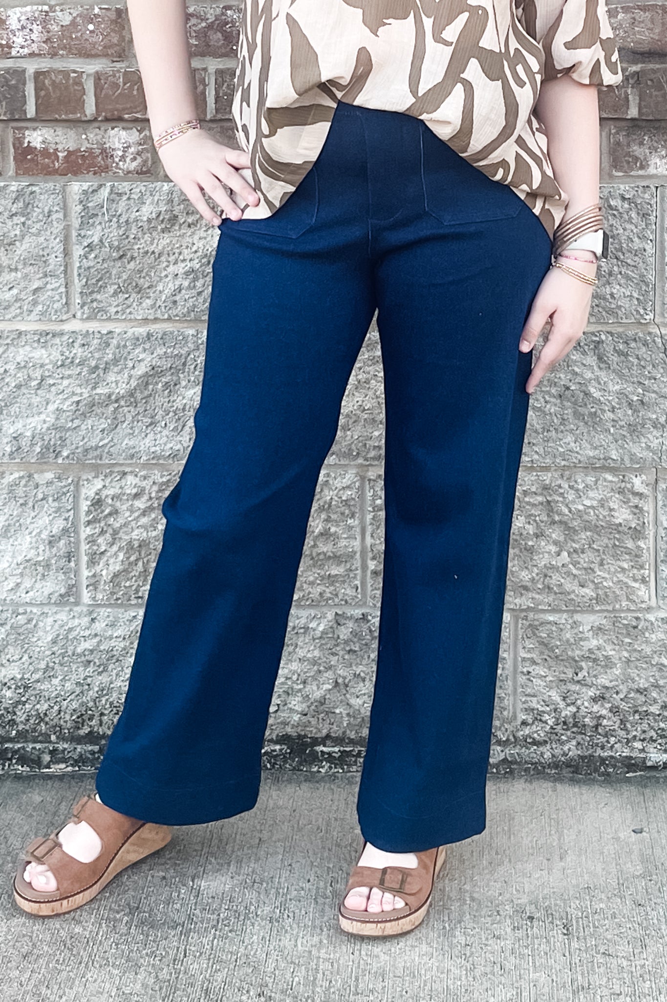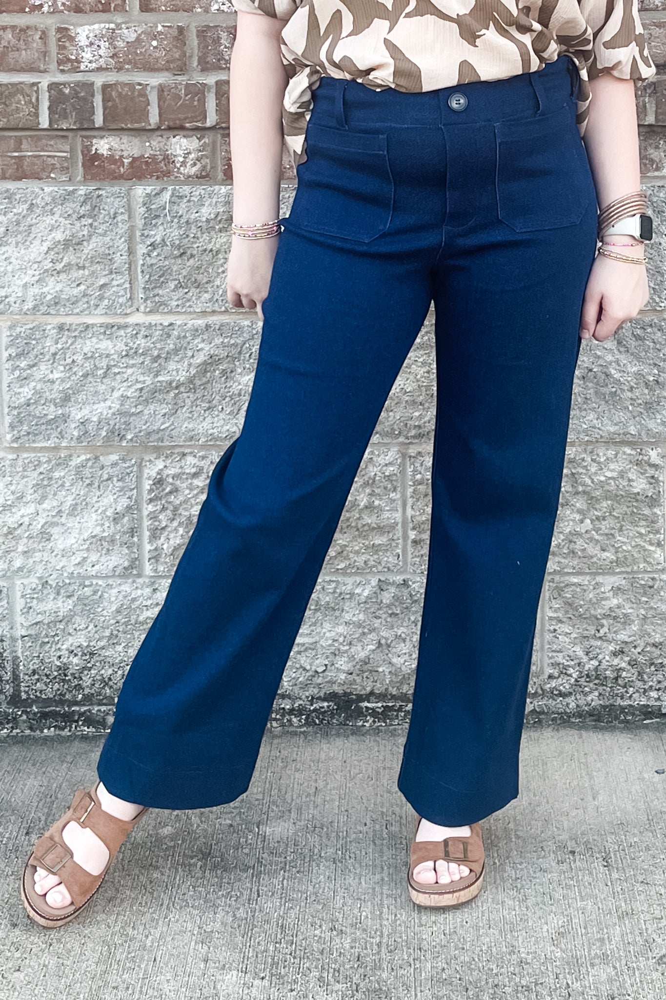 Pull on jeans from Umgee - the perfect option for the office. A comfortable, yet trendy high rise and wide leg silhouette style with patch pockets, a faux front button, functional back pockets and belt loops.