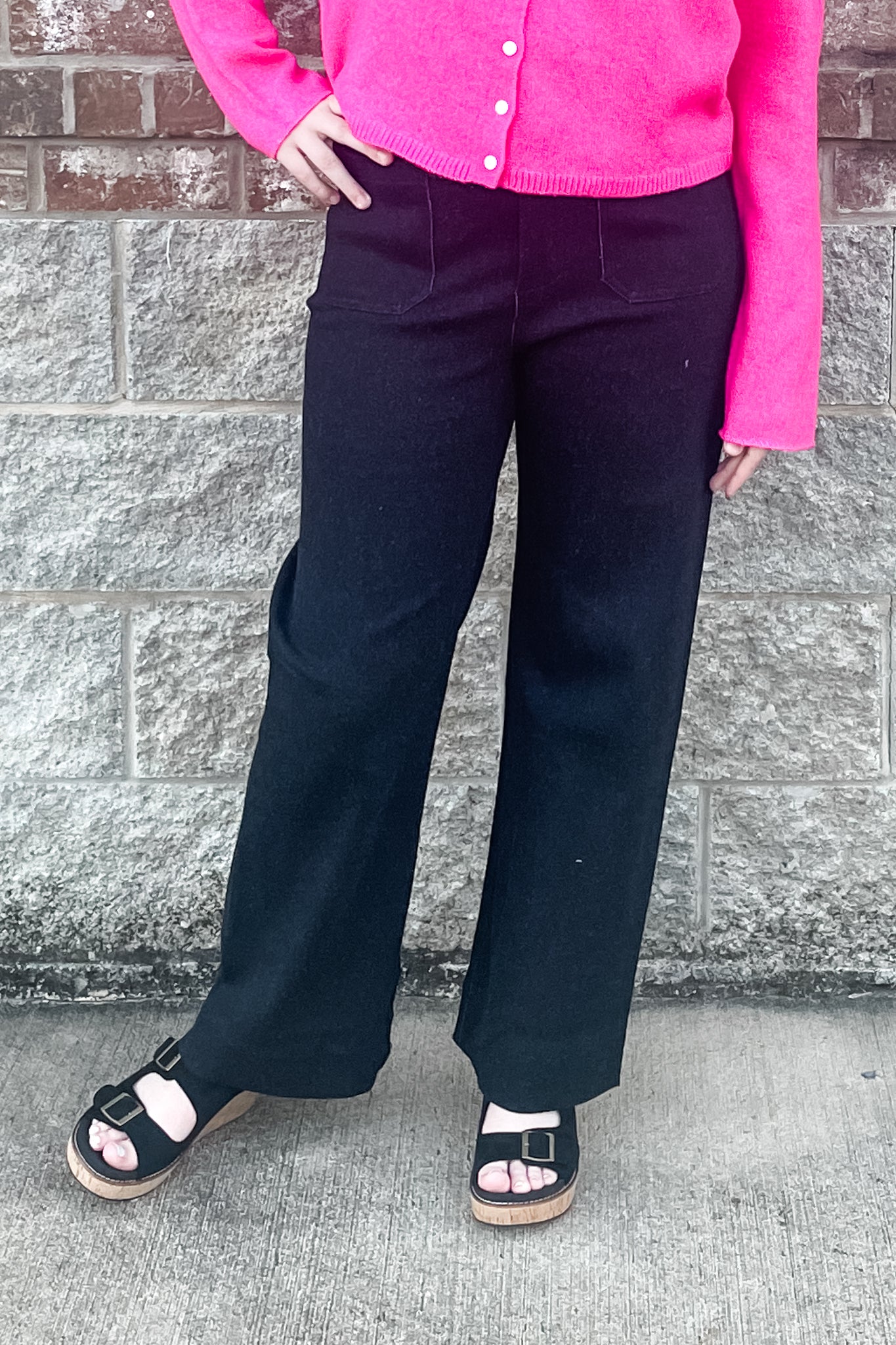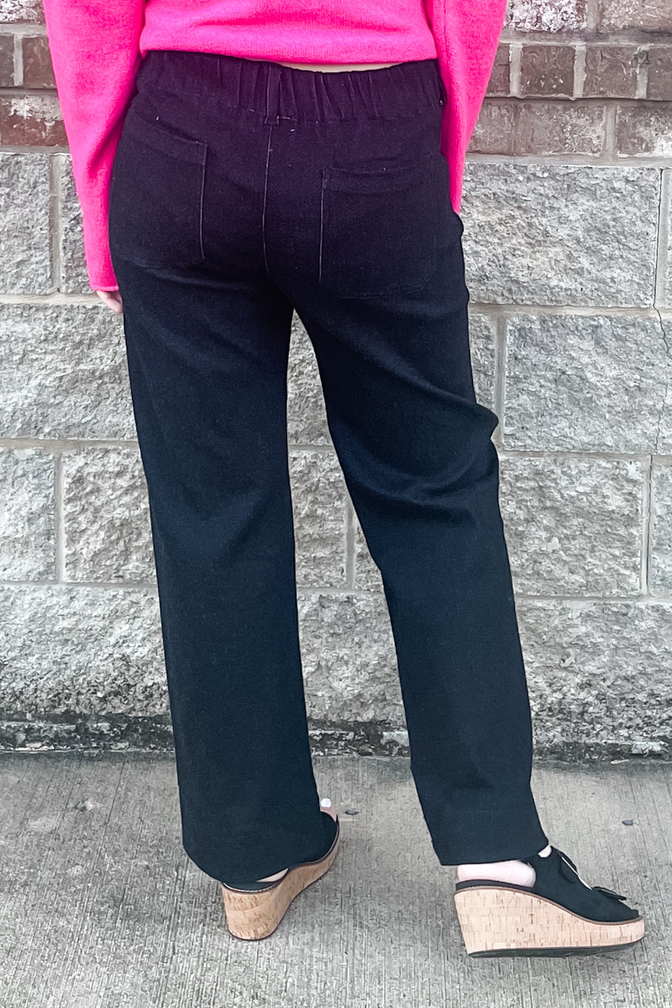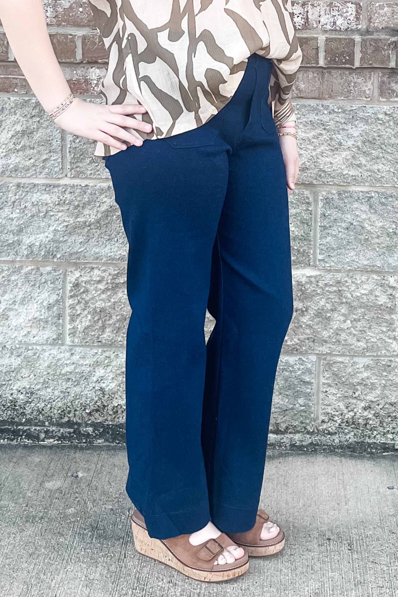 Pull on jeans from Umgee - the perfect option for the office. A comfortable, yet trendy high rise and wide leg silhouette style with patch pockets, a faux front button, functional back pockets and belt loops.