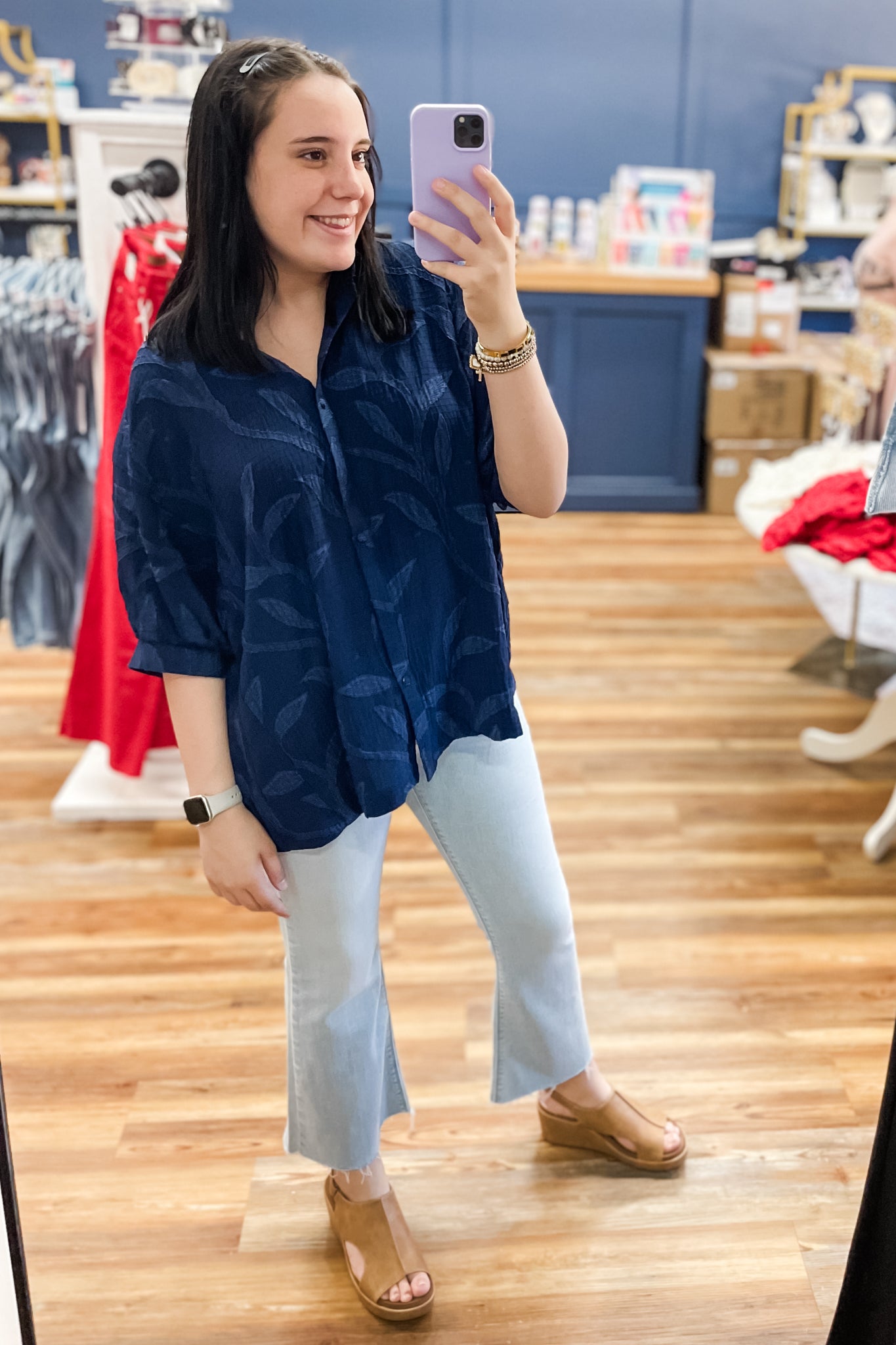 A beautiful button down navy blouse with a leaf jacquard allover pattern in a slightly lighter blue. This top has dolman sleeves that are elbow length and fits very generous.