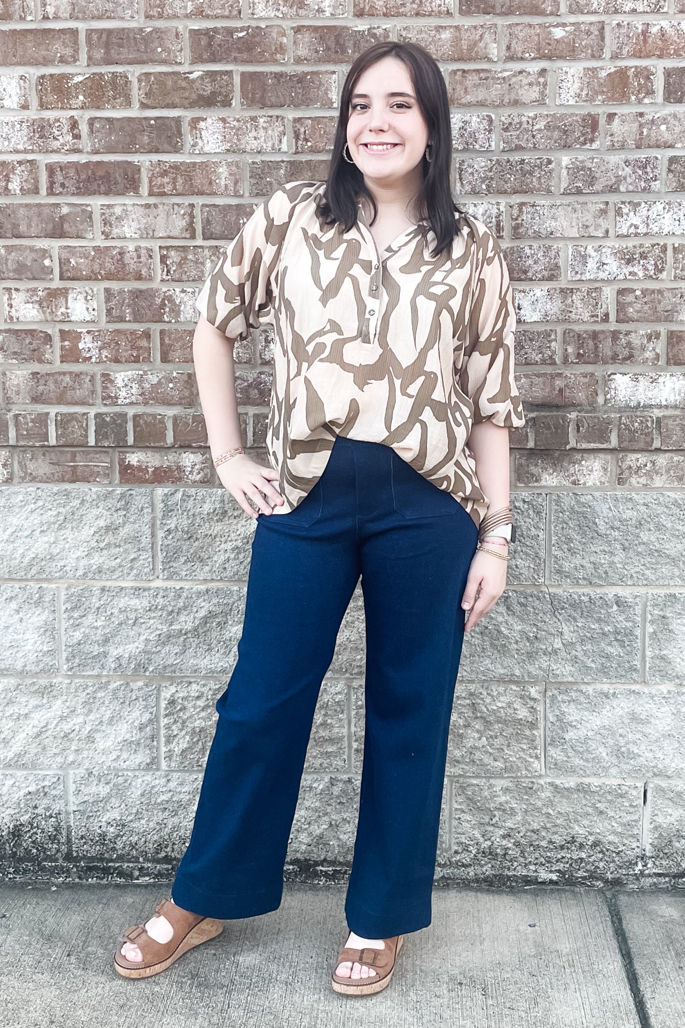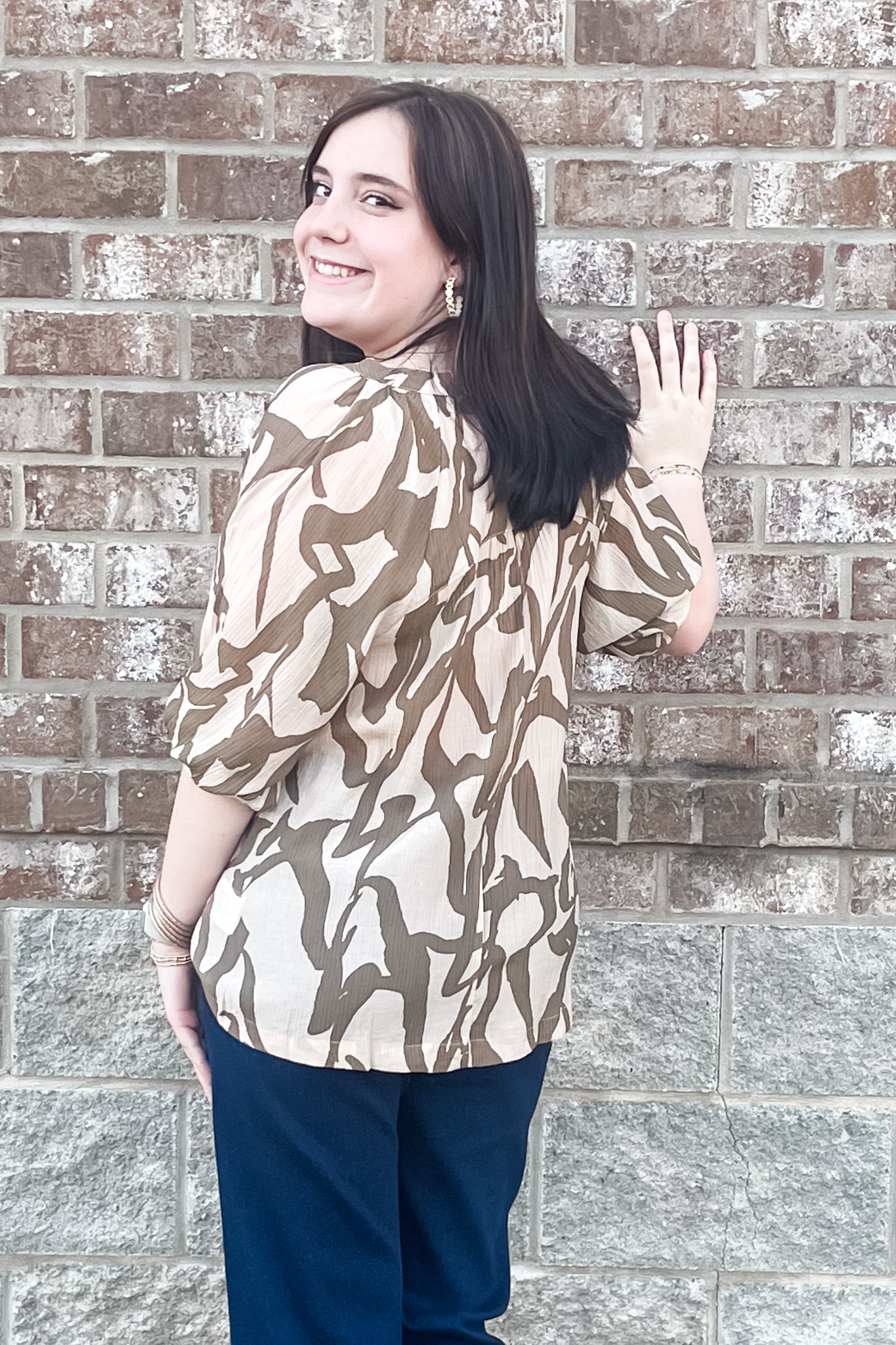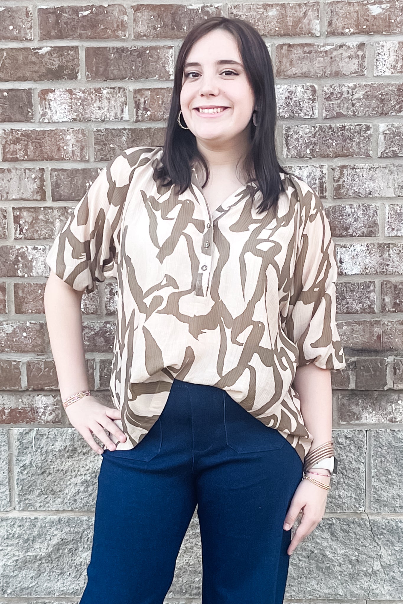 Meet the Desert Muse top, a lightweight blouse designed for effortless style in every season. This taupe-mix print brings a soft, abstract, desert-inspired pattern that feels both modern and understated, perfect for women who love elevated basics with personality.