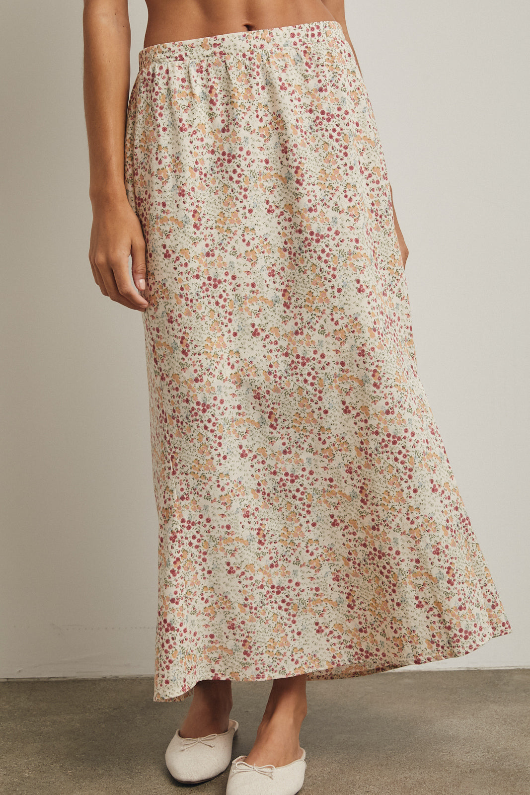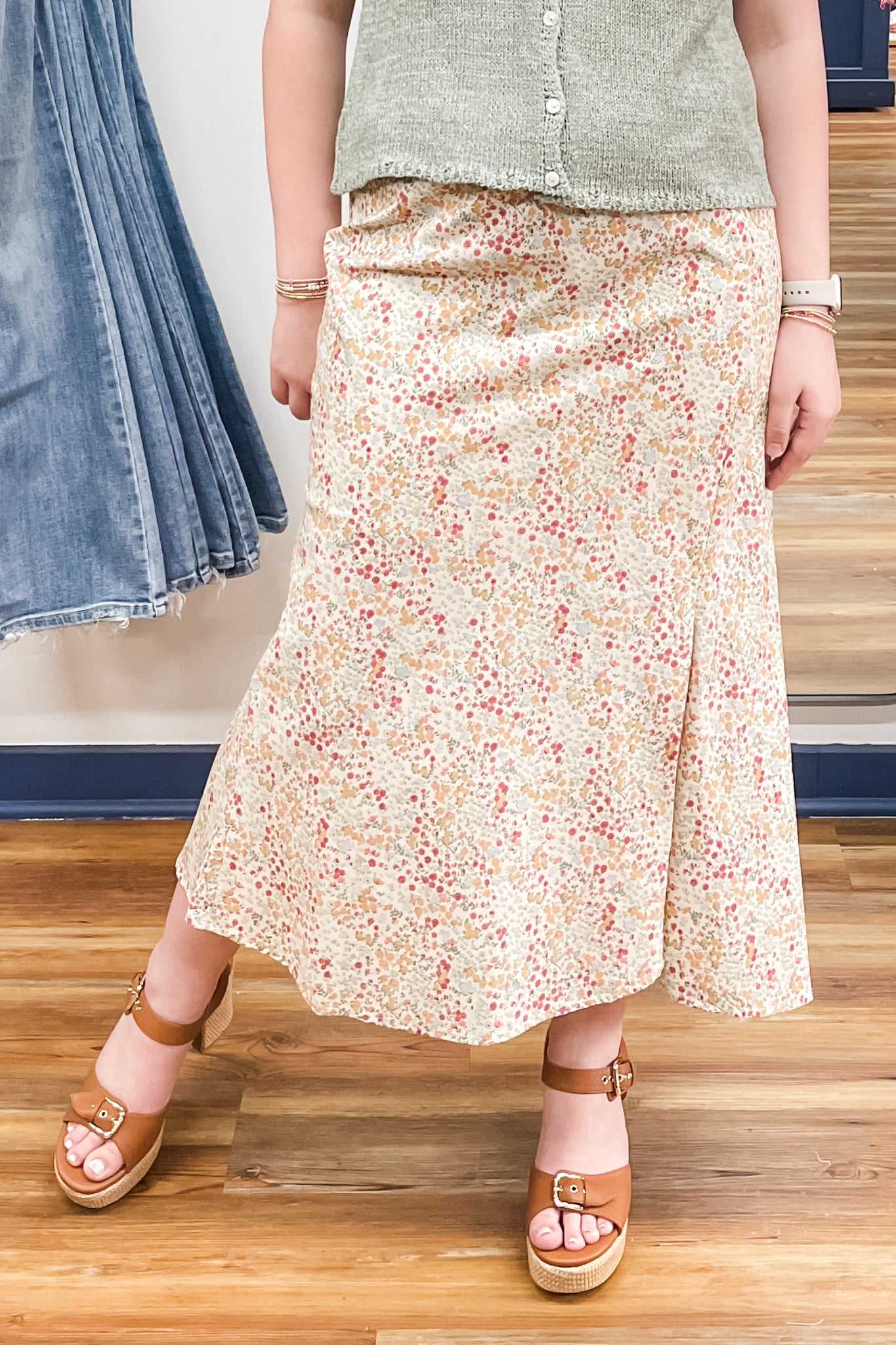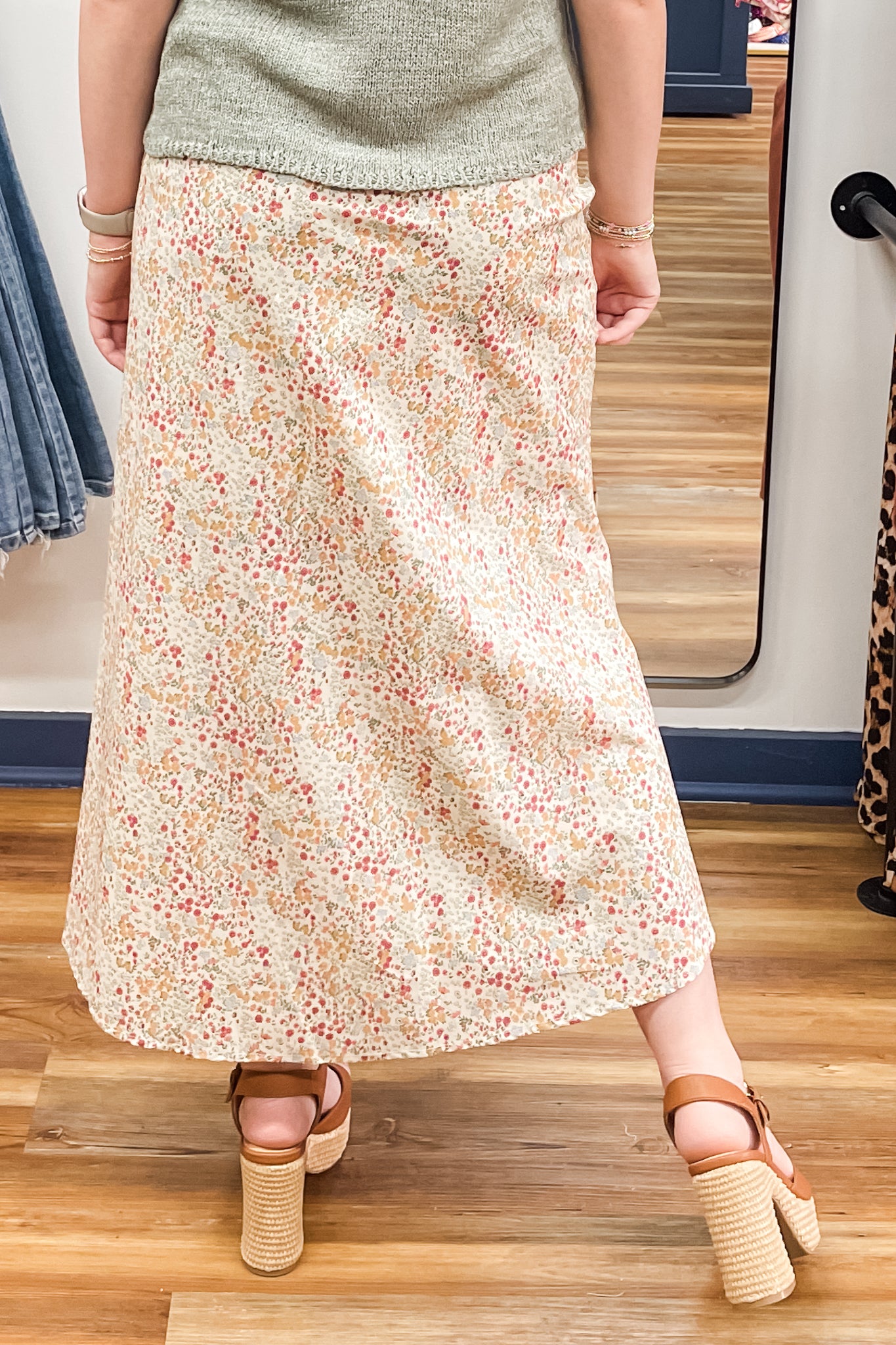 Jessie is another lovely midi length skirt for your spring rotation! A "natural" combo with little green, blue, peach and rosy floral pattern allover, which makes it a versatile option for so many tops and denim jacket/vest pairings. Featuring a front slit, side zipper, elastic back waistband and lining.
