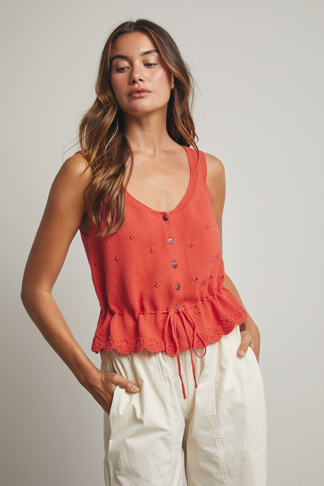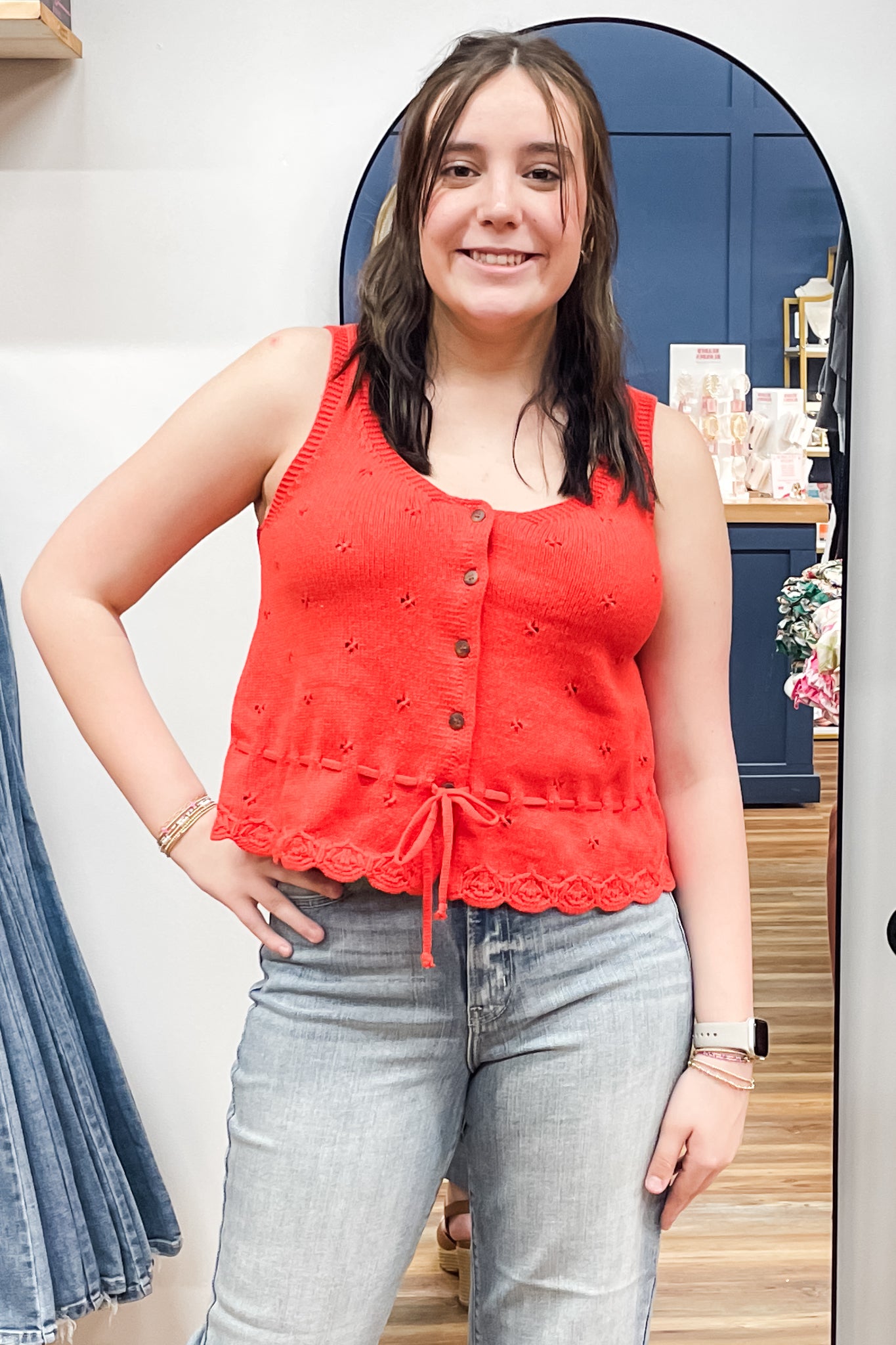 Another bright, cheerful sweater - this time in a papaya colored sweater tank top with a scalloped hem, embroidery, functional buttons and waist tie.