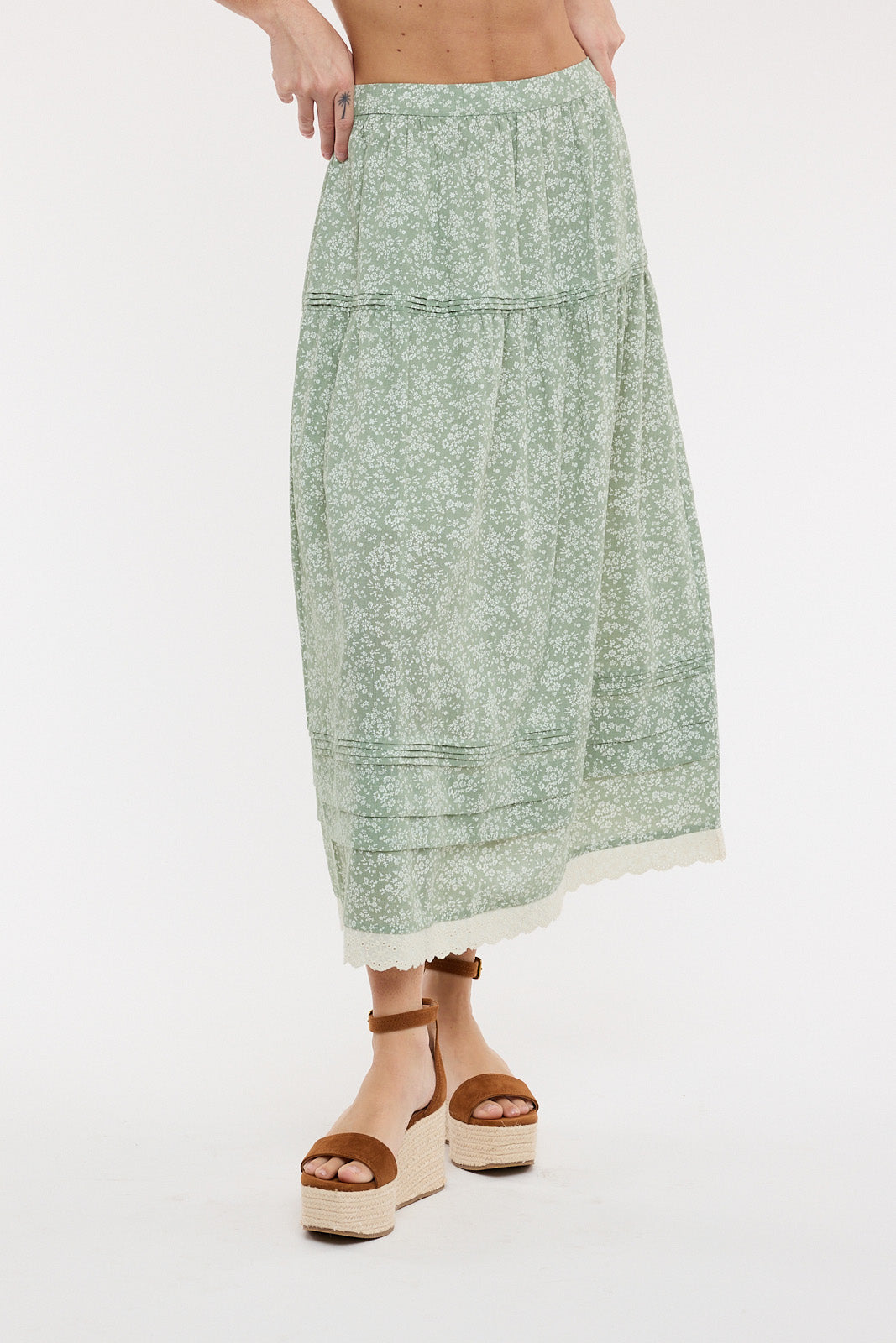 A lovely, feminine midi/maxi length skirt that is perfect for spring! Floral print in a soft sage color with off-white lace trim and ruffle details. Featuring an elastic waist in the back, pockets and lining.